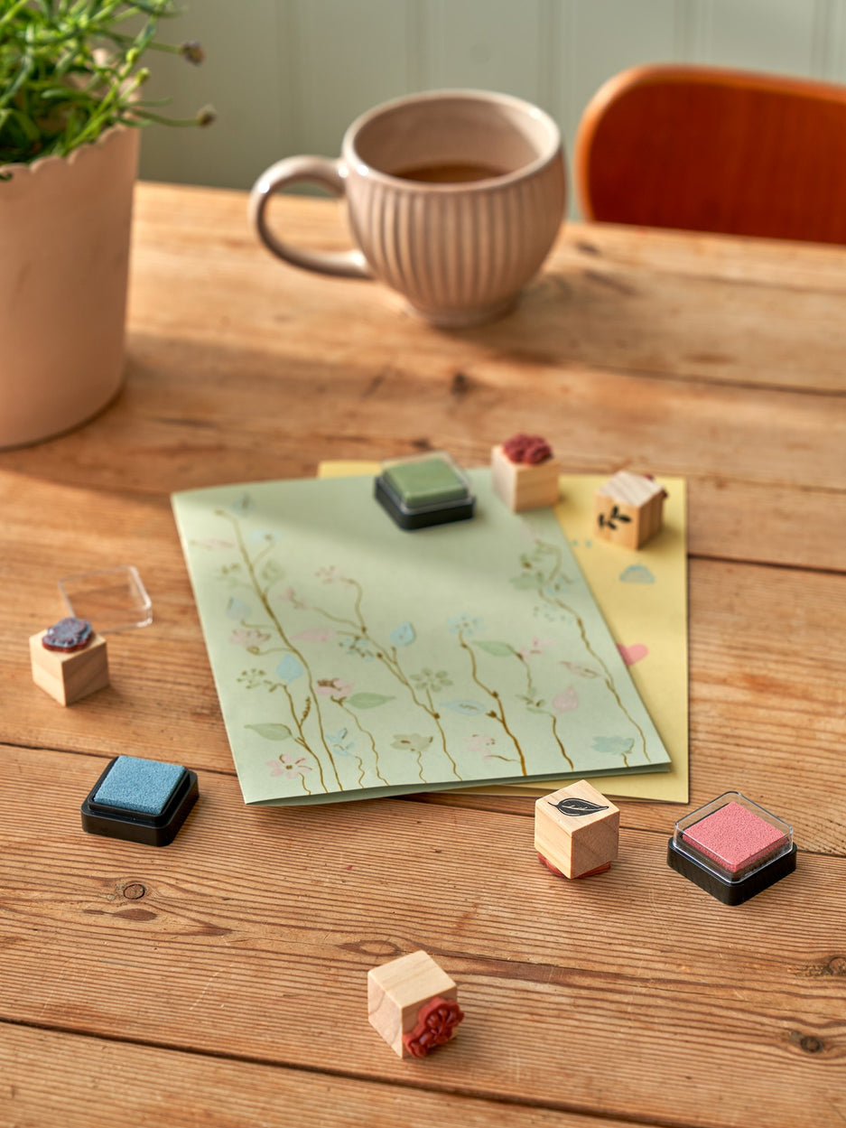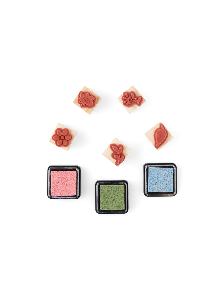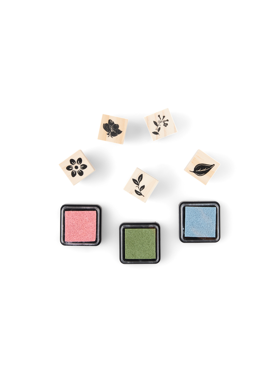 The sisters' stamp set is 100% FSC®-certified and the set contains 5 stamps with different motifs, as well as 3 ink pads in different colours.