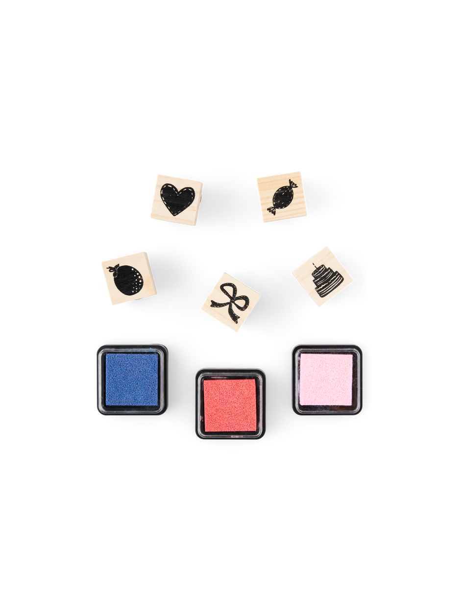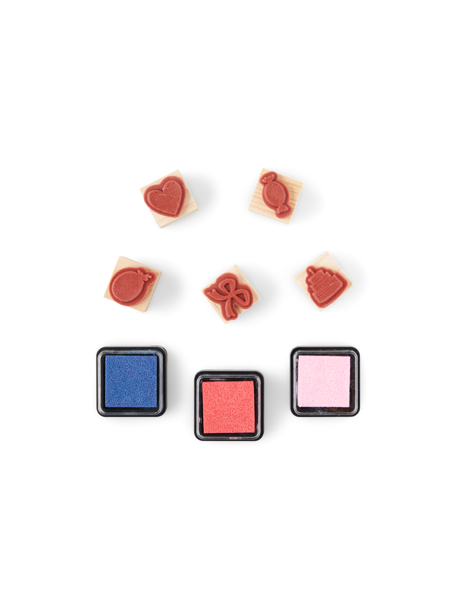 The sisters' stamp set is 100% FSC®-certified and the set contains 5 stamps with different motifs, as well as 3 ink pads in different colours.