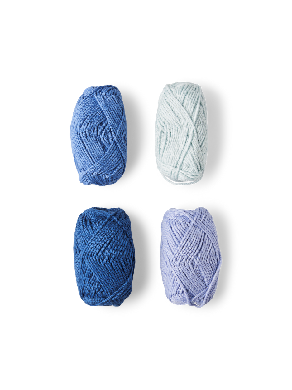The sisters' 8/4 yarn is made of STANDARD 100 by OEKO-TEX®-certified cotton and comes in a set of four. Each ball of yarn weighs 10 g and has a length of approximately 32 m.