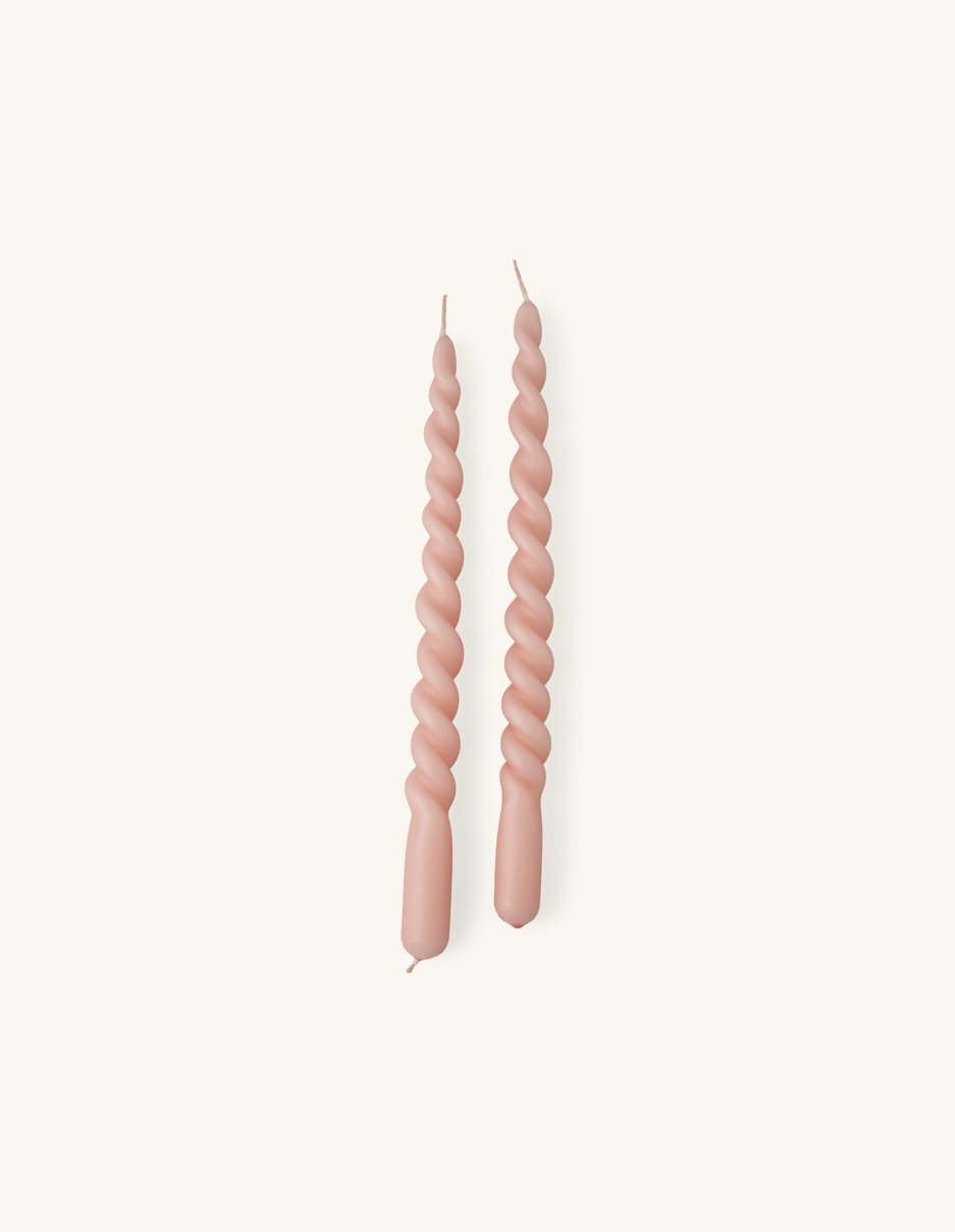 The sisters' twisted candles are made of paraffin wax and measure 28 x 2.2 cm. They have an approximate burn time of 9 hours.