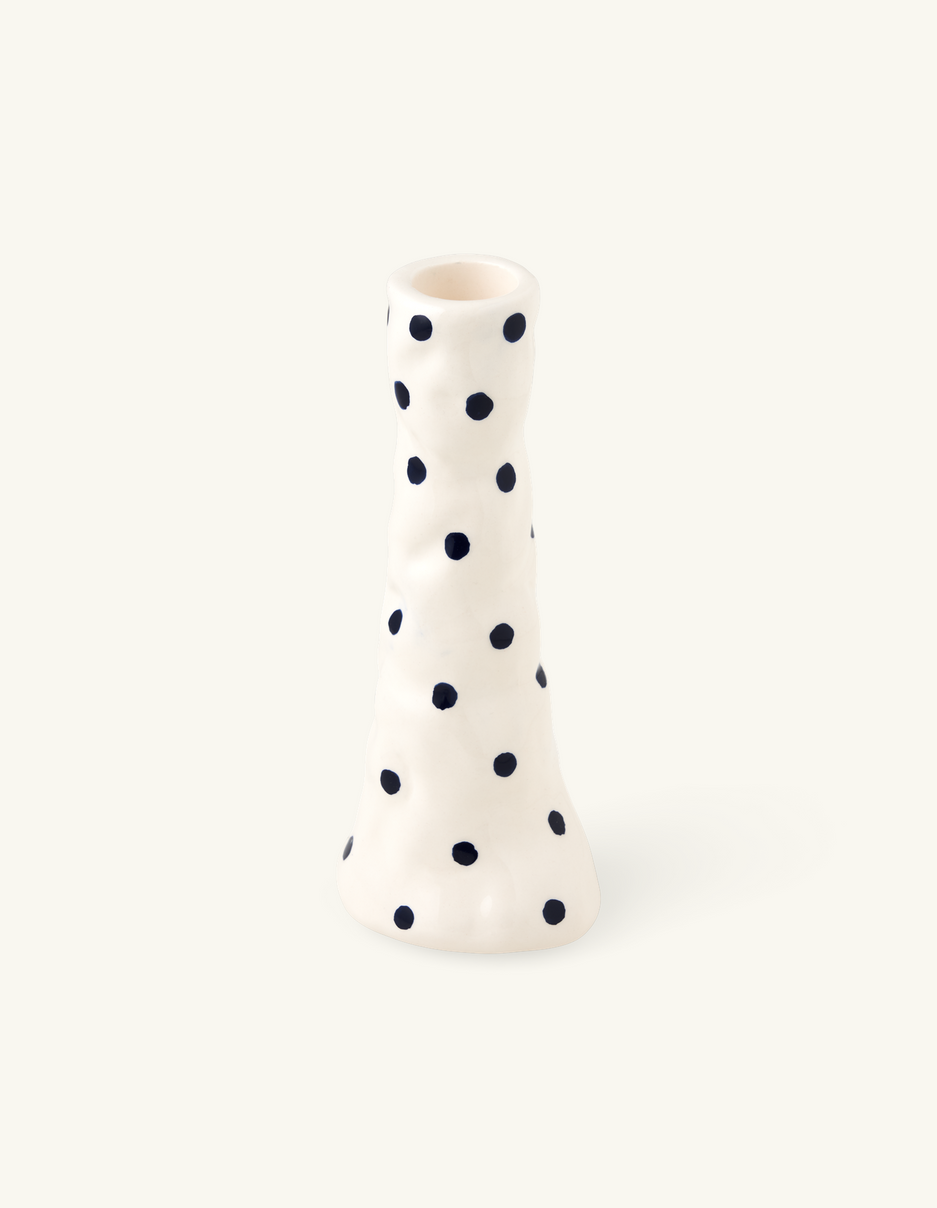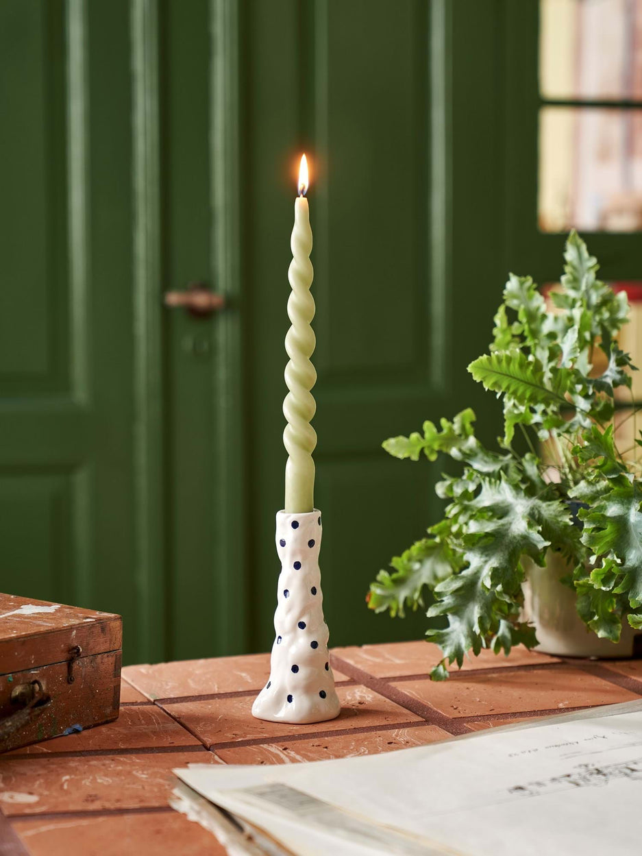 The sisters' stoneware candleholder measures 7 x 15.5 cm and has an inner diameter of 2.2 cm.