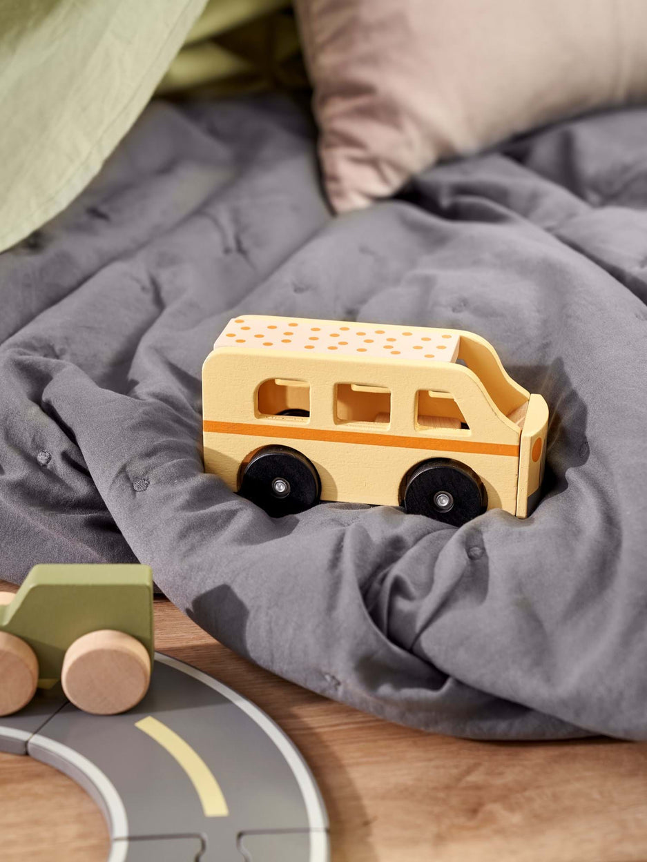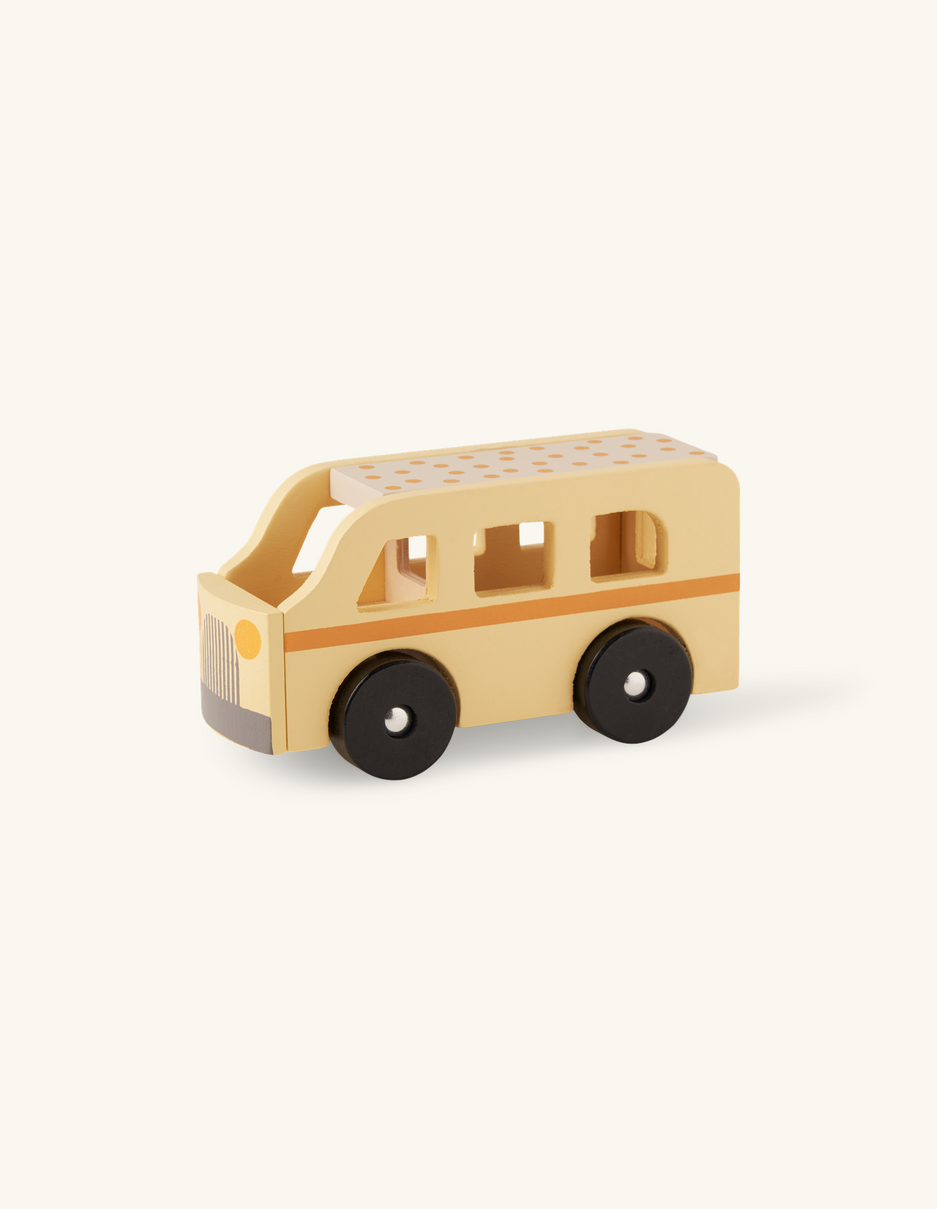 The sisters' toy bus is made of FSC®-certified plywood, schima superba and iron. It measures 15 x 6 x 8 cm.