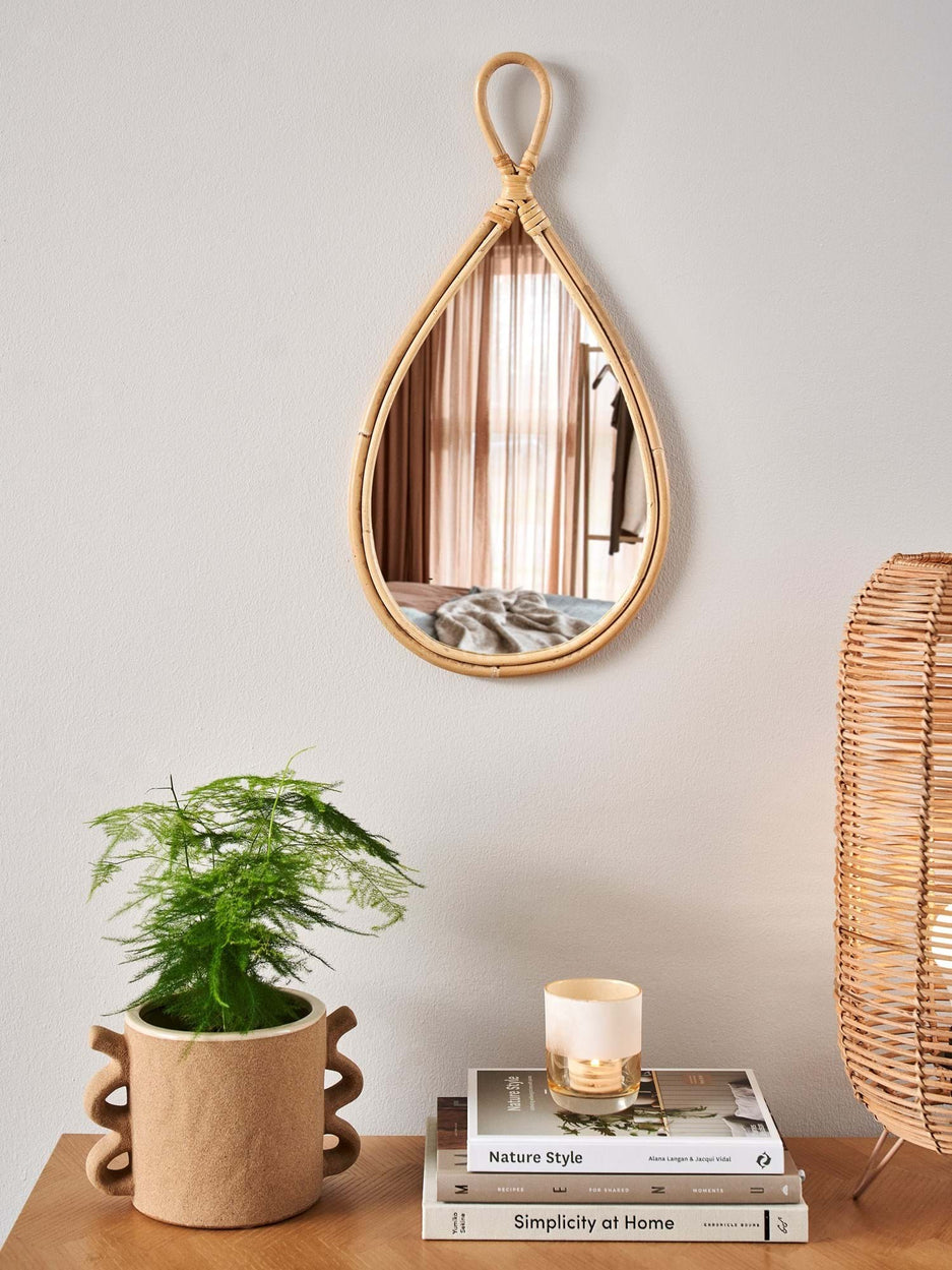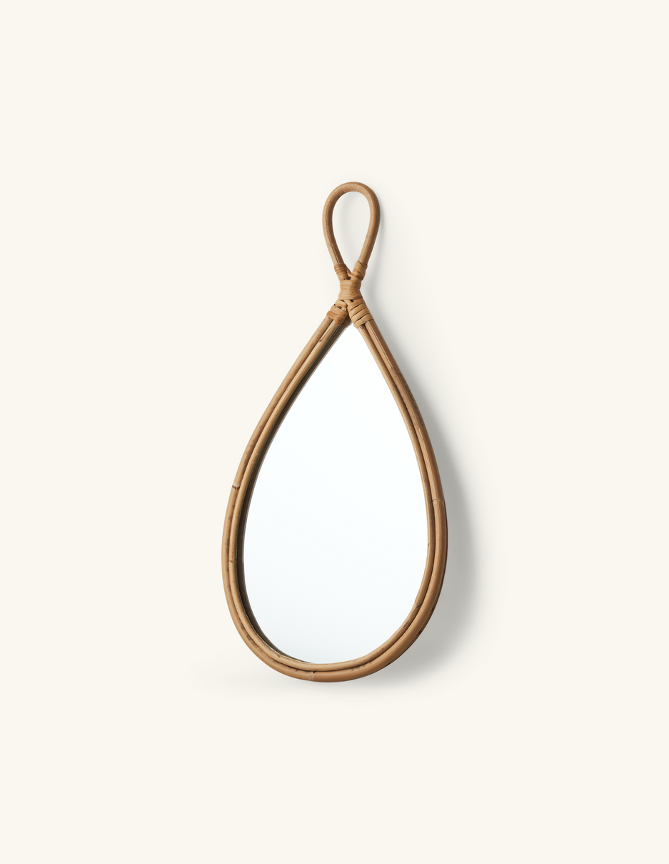 The sisters' mirror is made of rattan, poplar plywood, and glass. It measures 25 x 50 cm.