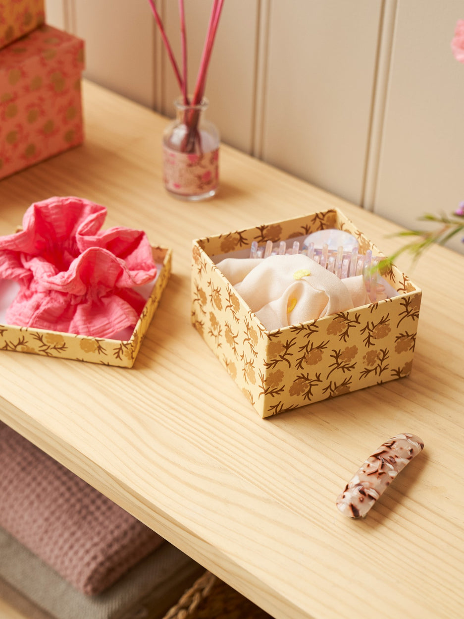 The sisters' box is made of sturdy cardboard and covered in handmade cotton paper. The box measures 12 x 12 x 7.1 cm.