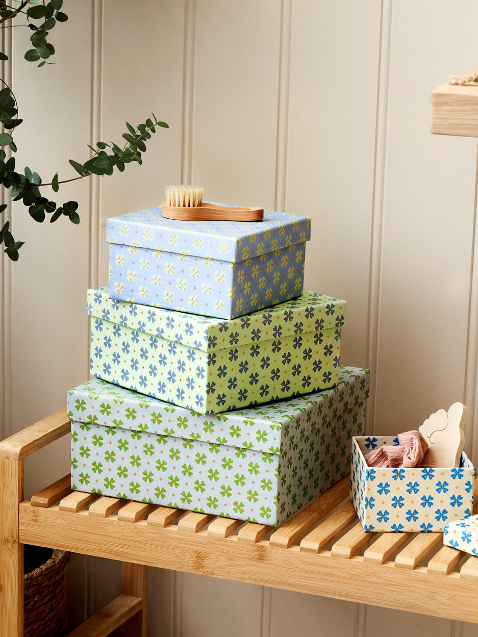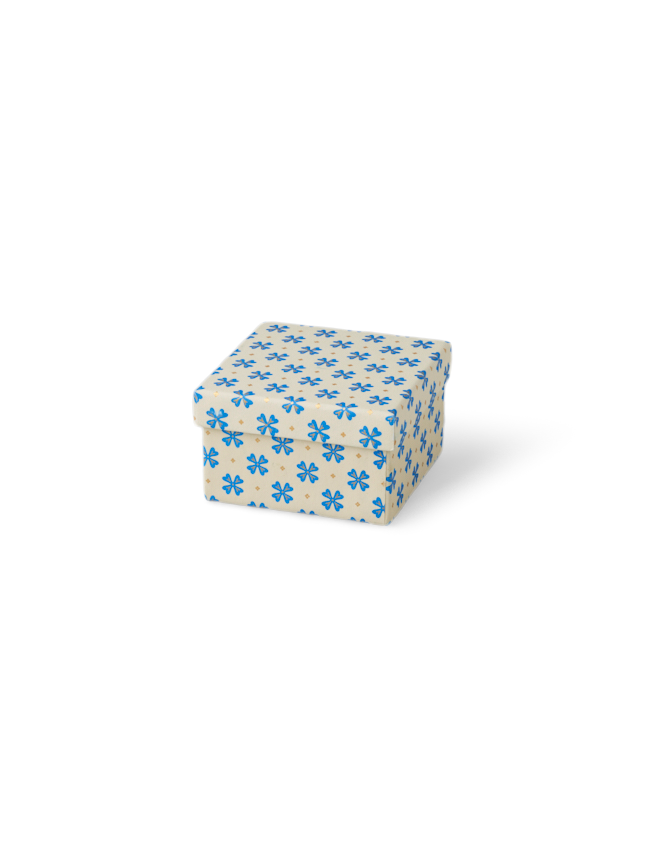The sisters' box is made of sturdy cardboard and covered in handmade cotton paper. The box measures 12 x 12 x 7.1 cm.