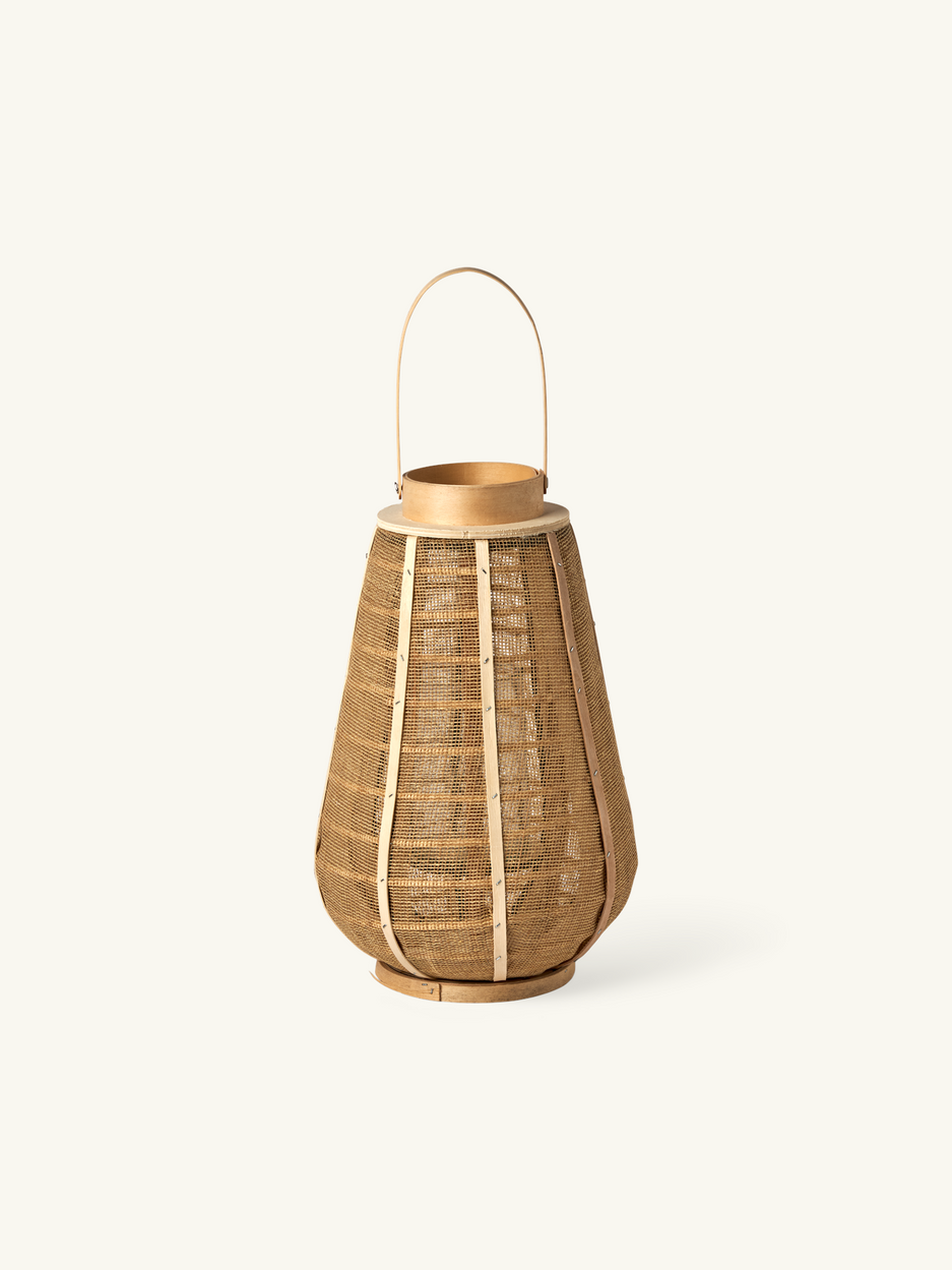 The sisters' lantern is made of 100% FSC®-certified poplar plywood and jute, and measures Ø25 x 40 cm. It has a glass container inside measuring Ø10 x 15 cm.