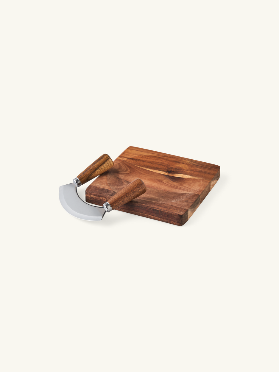 Akasíu viður/ryðfrítt stál. 11 x 13 cm/17 x 17 x 1.9 cm.