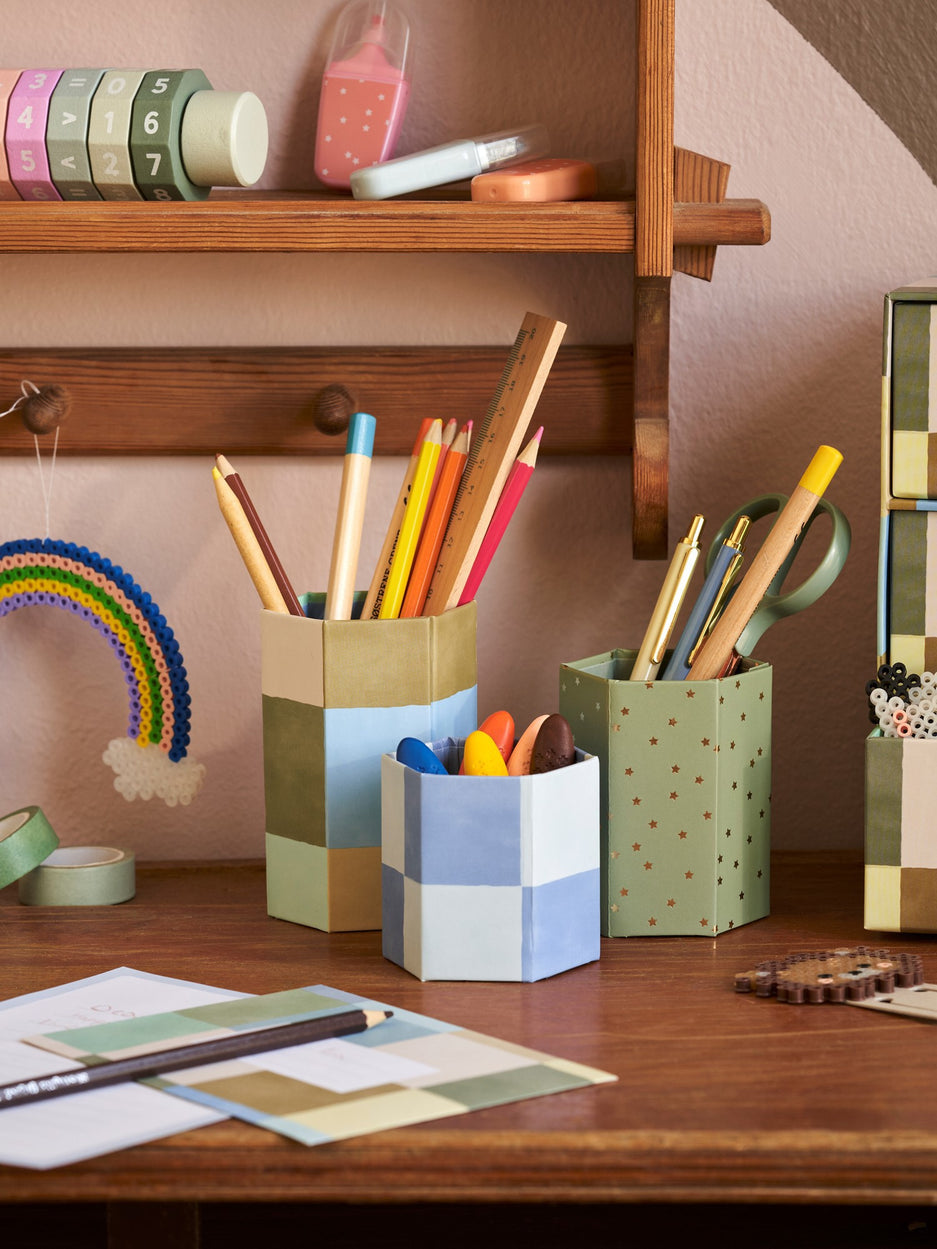The sister's pencil holder set consists of three FSC®-certified paper cups. The cups can be connected by their magnetic sides.