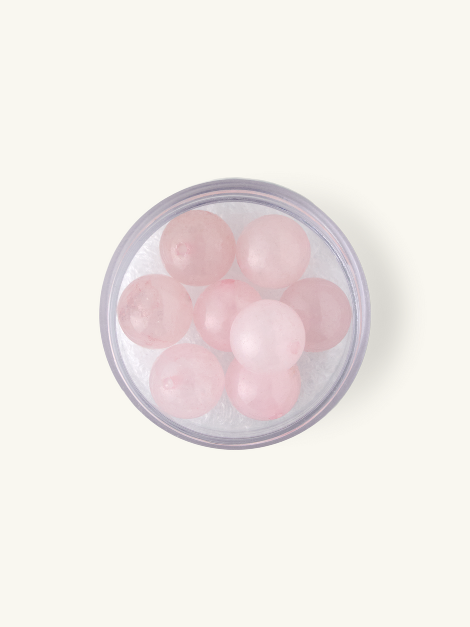 The sisters' rose quartz beads measure approximately 10 mm in diameter, but the colour and size may vary due to the natural material. A packet contains 8 pcs.
