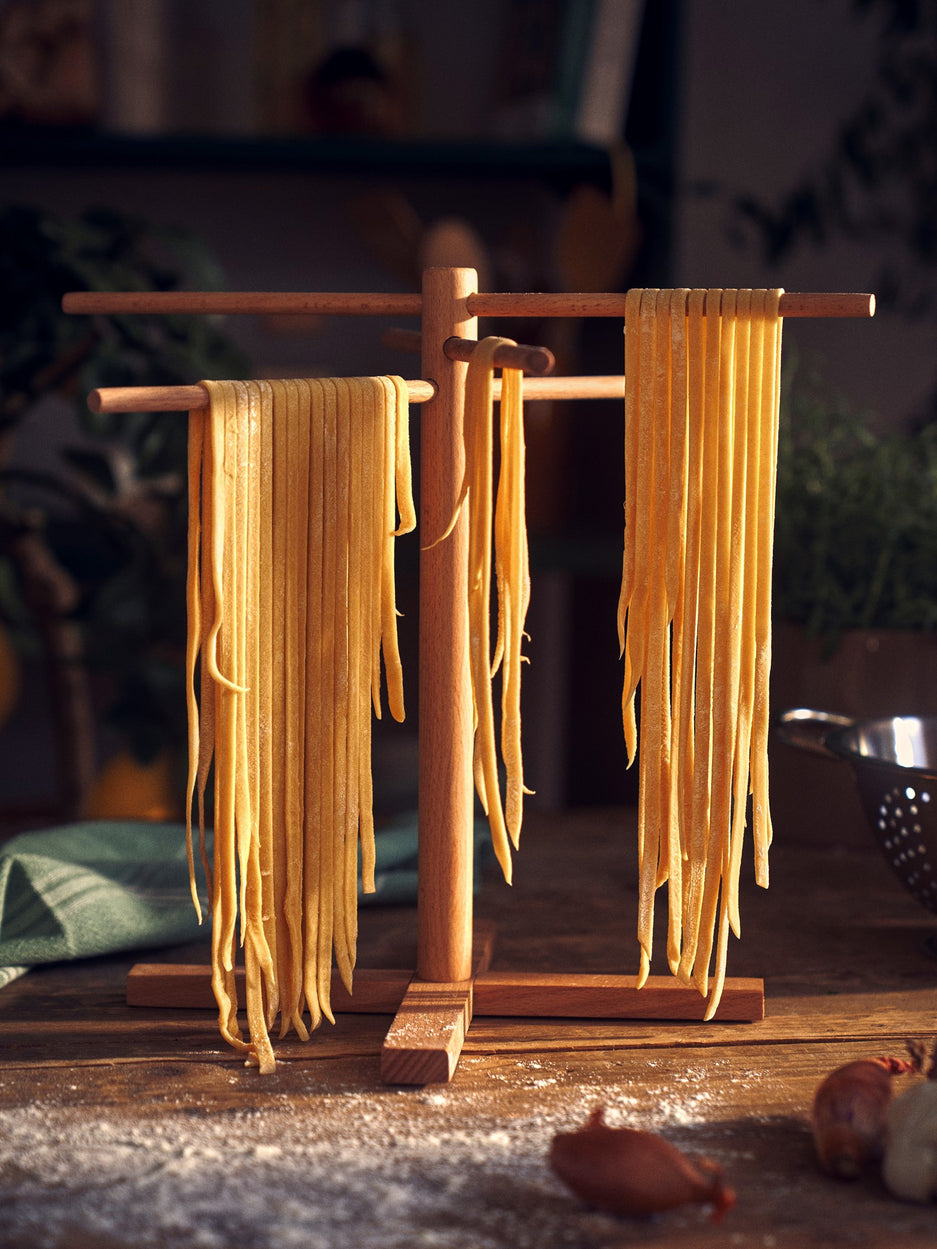 The sisters' pasta drying rack is made of FSC®-certified beech wood as well as stainless steel.