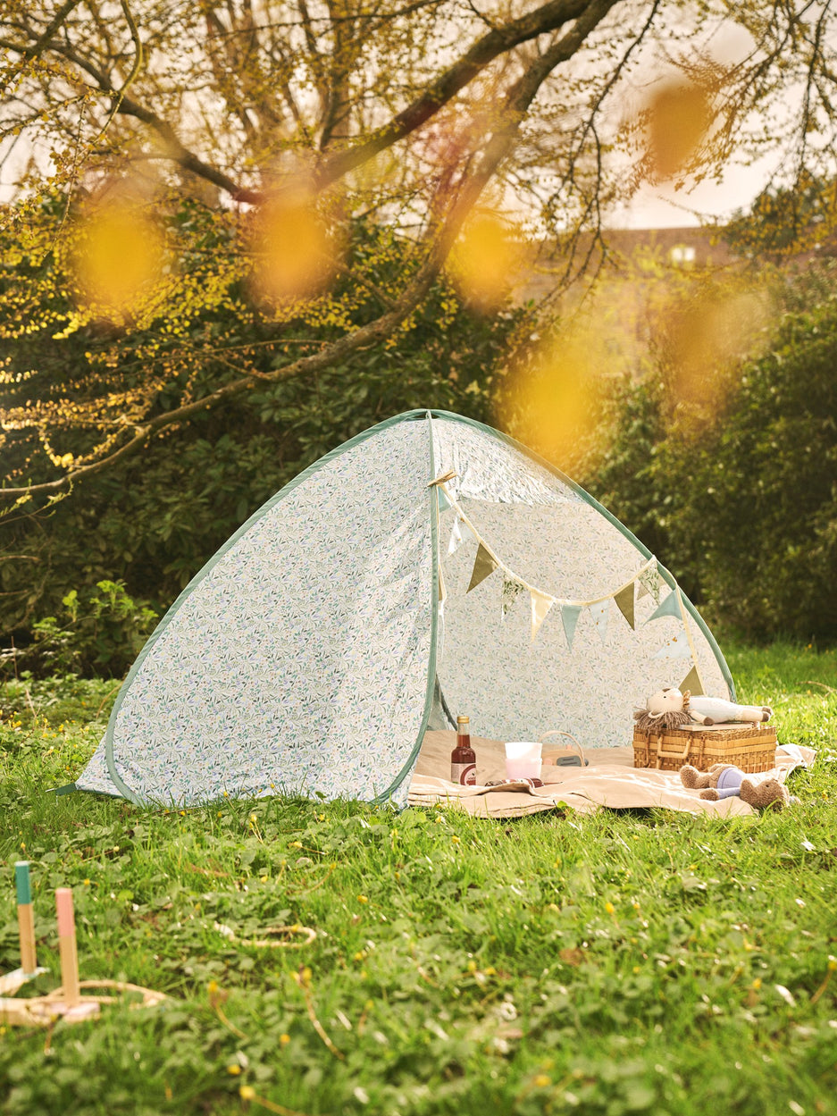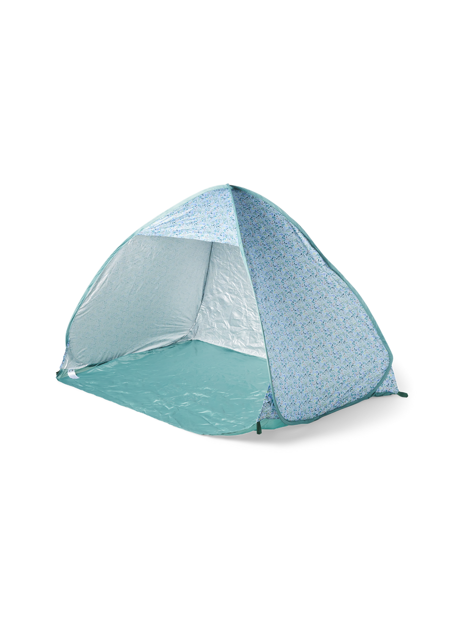 The sisters' pop-up beach tent for children is made of polyester and metal, and measures 150 x 93 x 93 cm.