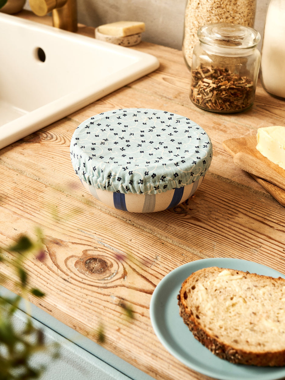 The sisters' cover is made of STANDARD 100 by OEKO-TEX®-certified* cotton and has a rubber elastic to tighten it around your container. It can be used as an alternative to clingfilm and aluminium foil.