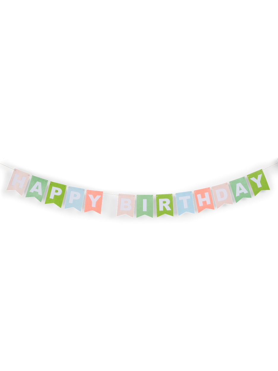 The sisters' garland has pennants in polyetser and cotton spelling out Happy Birthday. The pennants are approximately 10 x 14 cm.