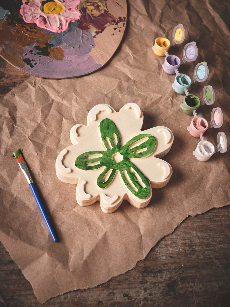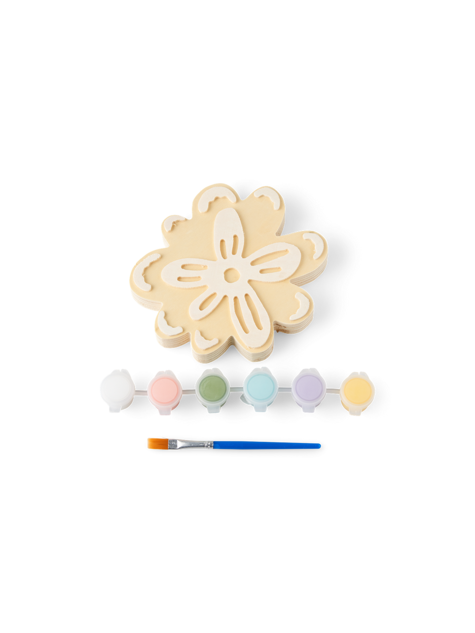 The sisters' DIY-set contains a 3D flower made of 100% FSC®-certified poplar wood, as well as 6 different colours of acrylic paint. The set also contains a paintbrush.