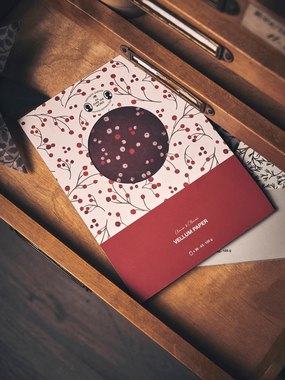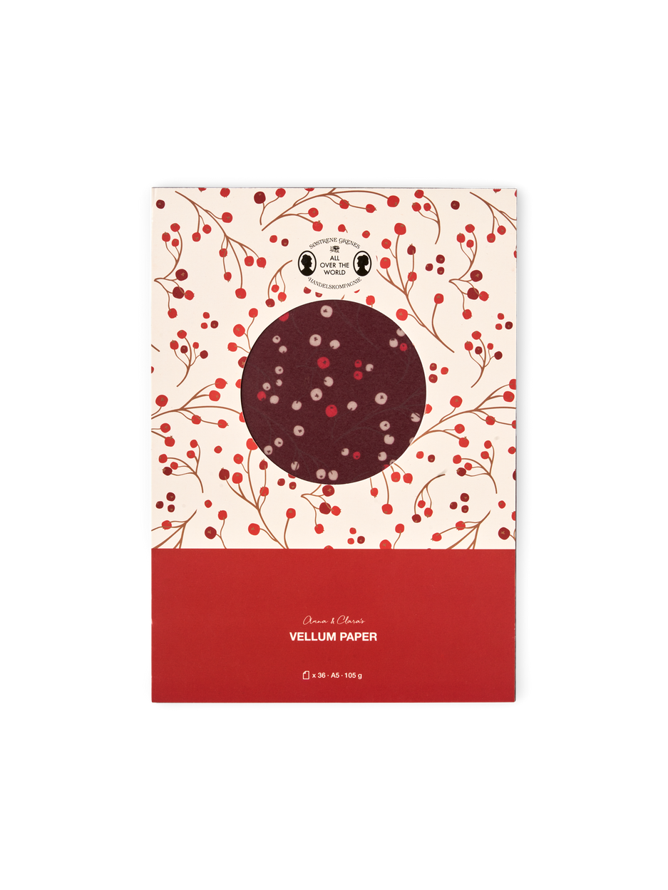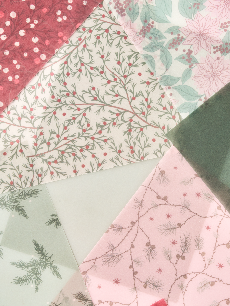 The sisters' vellum paper is 100% FSC®-certified. A packet contains 36 sheets, with 3 sheets per design. There are 6 different patterned designs and 6 different solid colour designs.