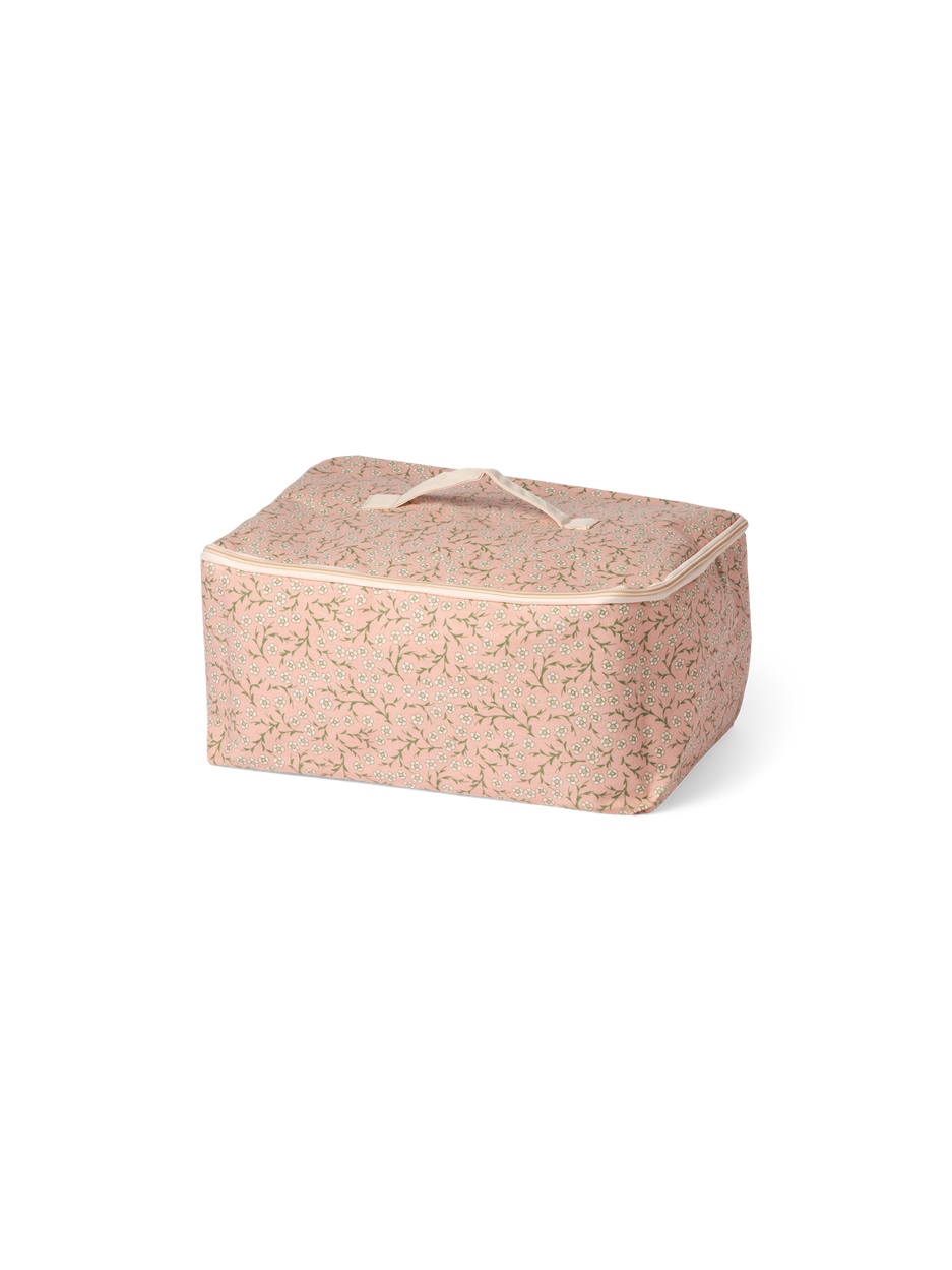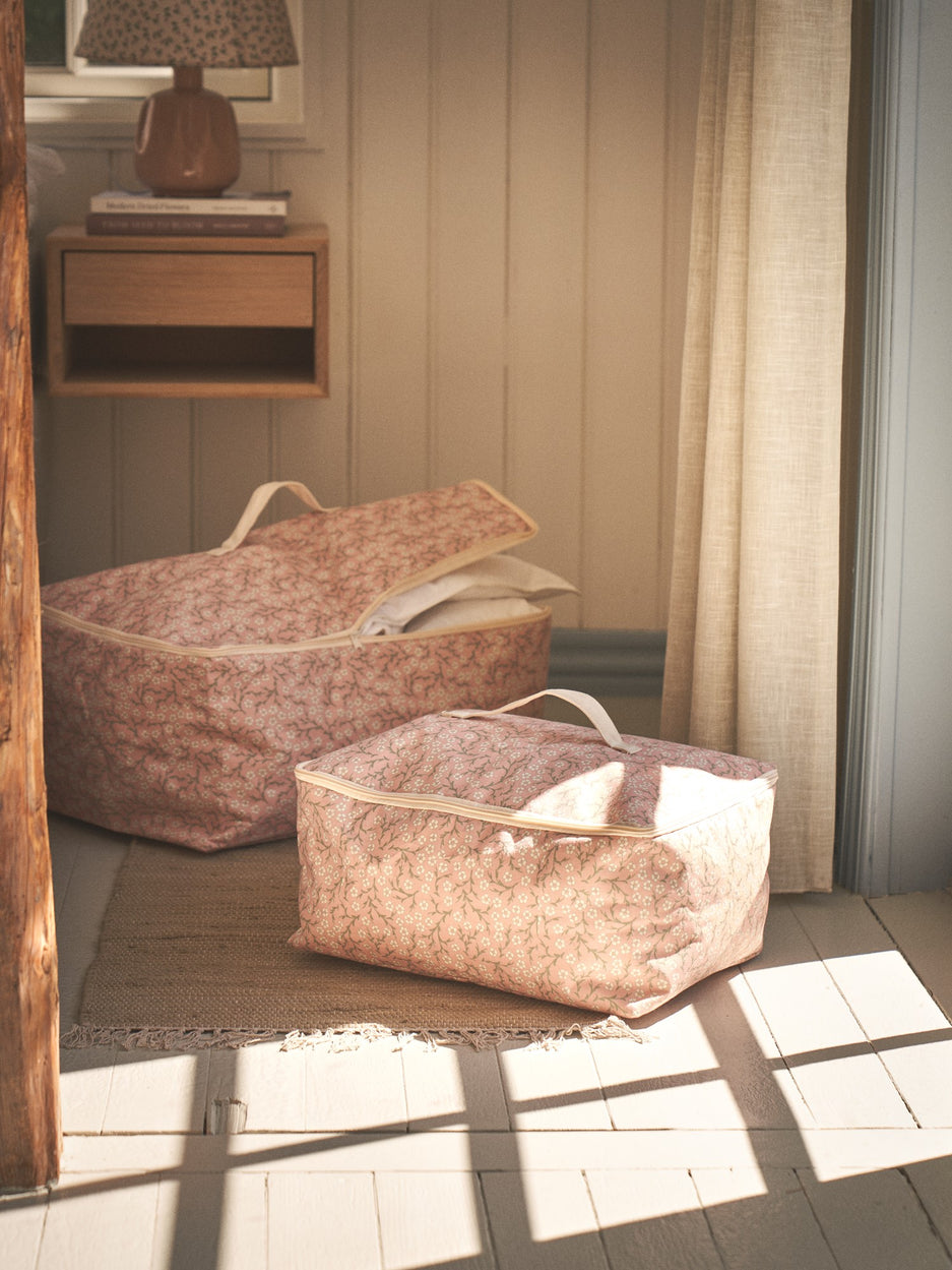 The sisters' storage bag is made of GRS-certified* cotton, of which 65% is recycled. It has a polyethylene coating. It measures 40 x 30 x 20 cm.