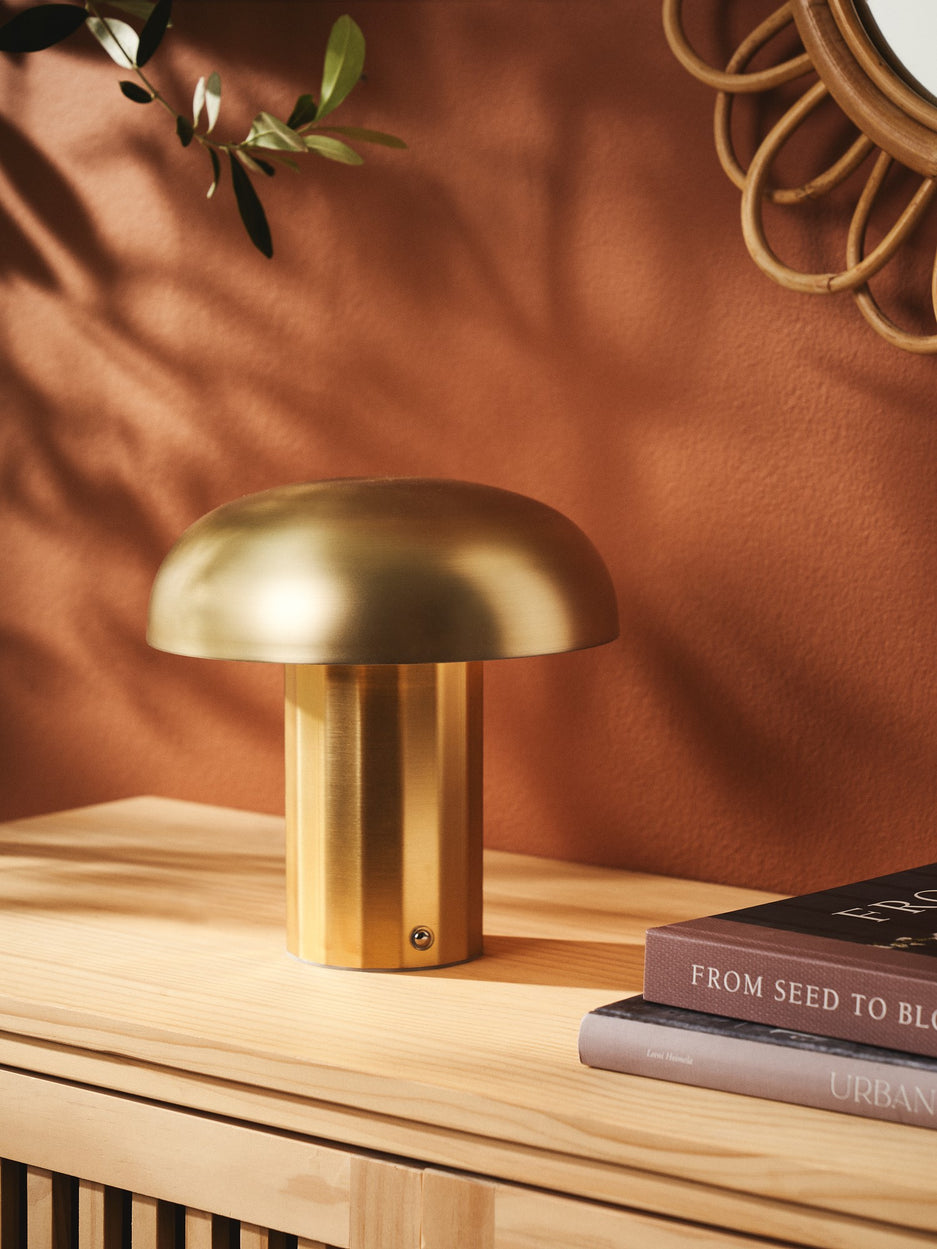 The sisters' table lamp is made of metal and is charged via a USB-cable. It has 3 levels of brightness that are controlled via touch. The battery lasts approximately 7-8 hours at 100% brightness, 18 hours at 70% brightness, and 36 hours at 40% brightness.