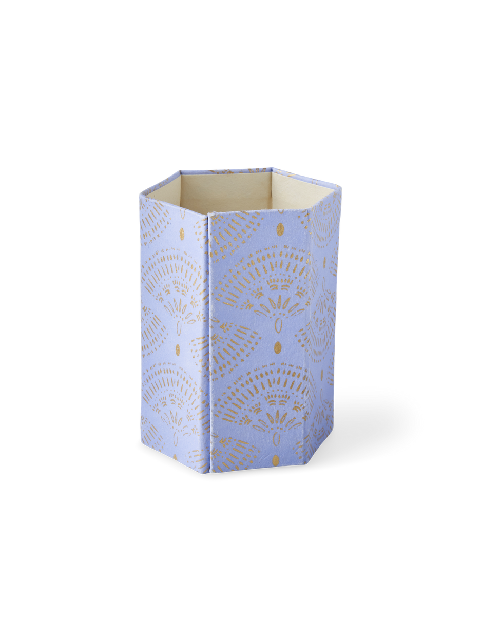 The sisters' penholder is handmade of cotton and paper. It has a lovely hexagon shape with a diameter of 8 cm and a height of 11 cm.