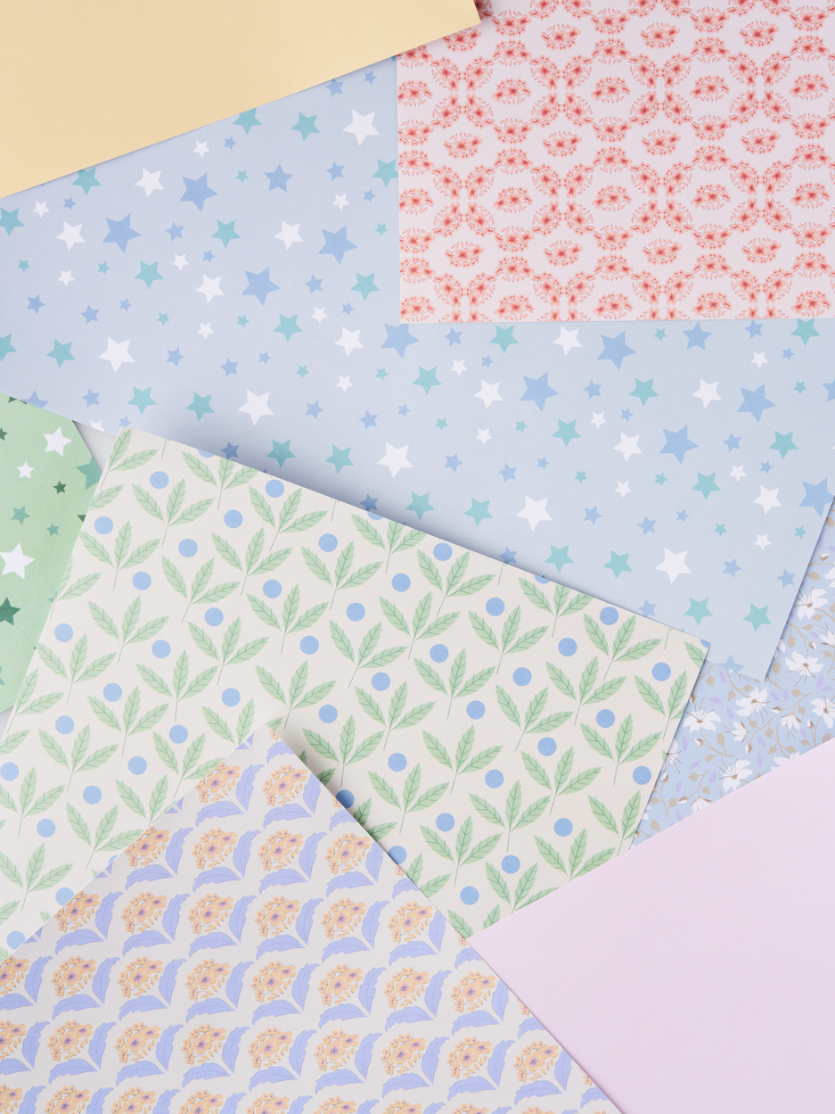 The sisters' hobby cardstock is made of FSC®-certified paper. A packet contains 12 sheets of 230 gsm in an A4-format and 4 different colours.