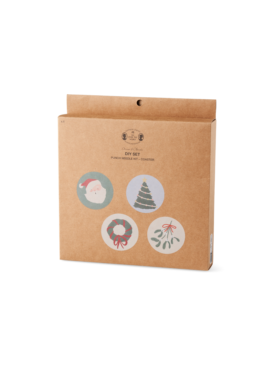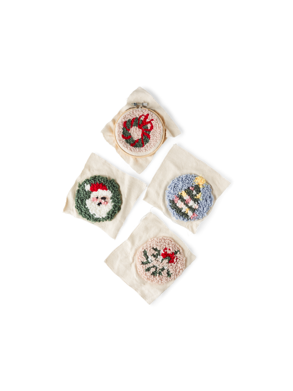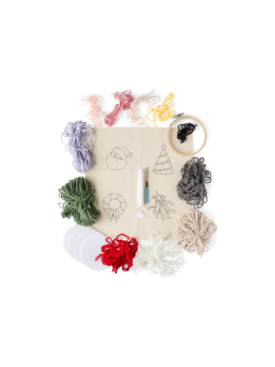 The sisters' punch needle set consists of a bamboo embroidery hoop with a diameter of 10.5 cm, fabric with four motifs, felt fabric for the backing, yarn, a punch needle and threader, fabric glue, and instructions.