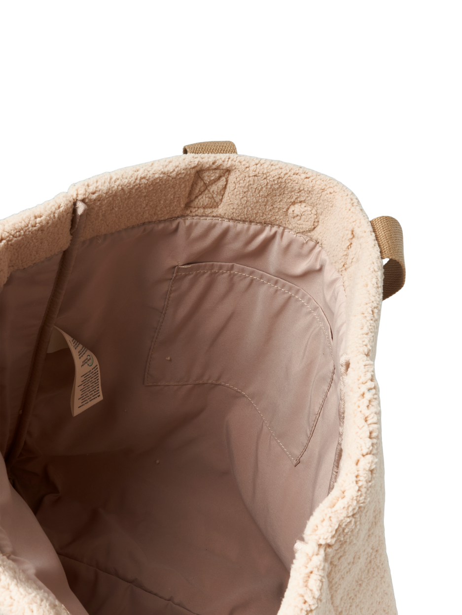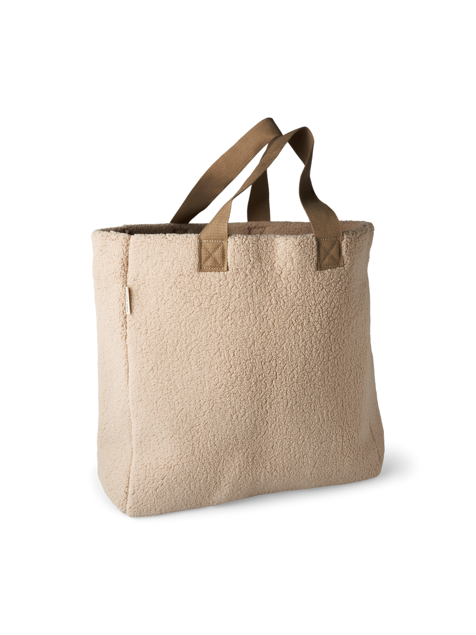 The sisters' bag with teddy fabric is made of 92% GRS-certified* recycled polyester as well as polyurethane. It measures 41 x 38 x 12 cm with strops measuring 43.5 cm.