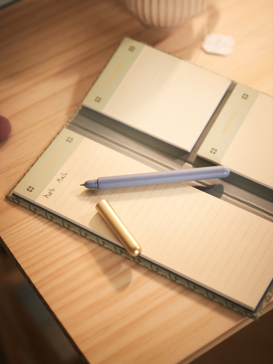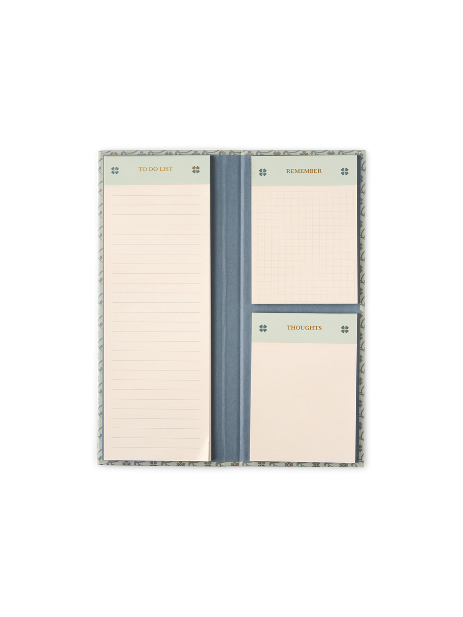 The sisters' notepad set is made of FSC®-certified paper and includes three pads. One pad has lined paper, one has grid paper, and one has blank paper.