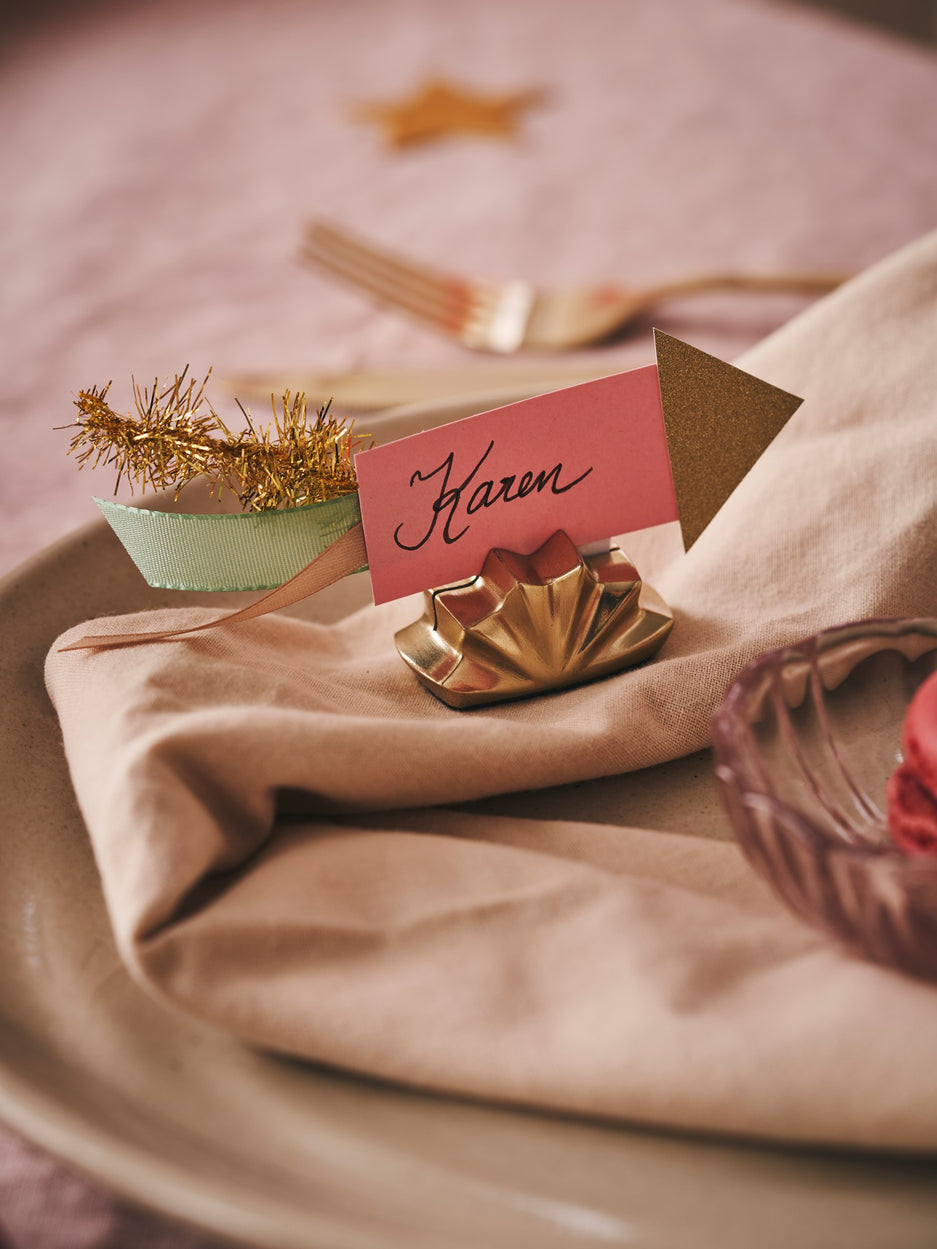 The sisters' place card holder is made of iron and measures 5 x 9 cm.