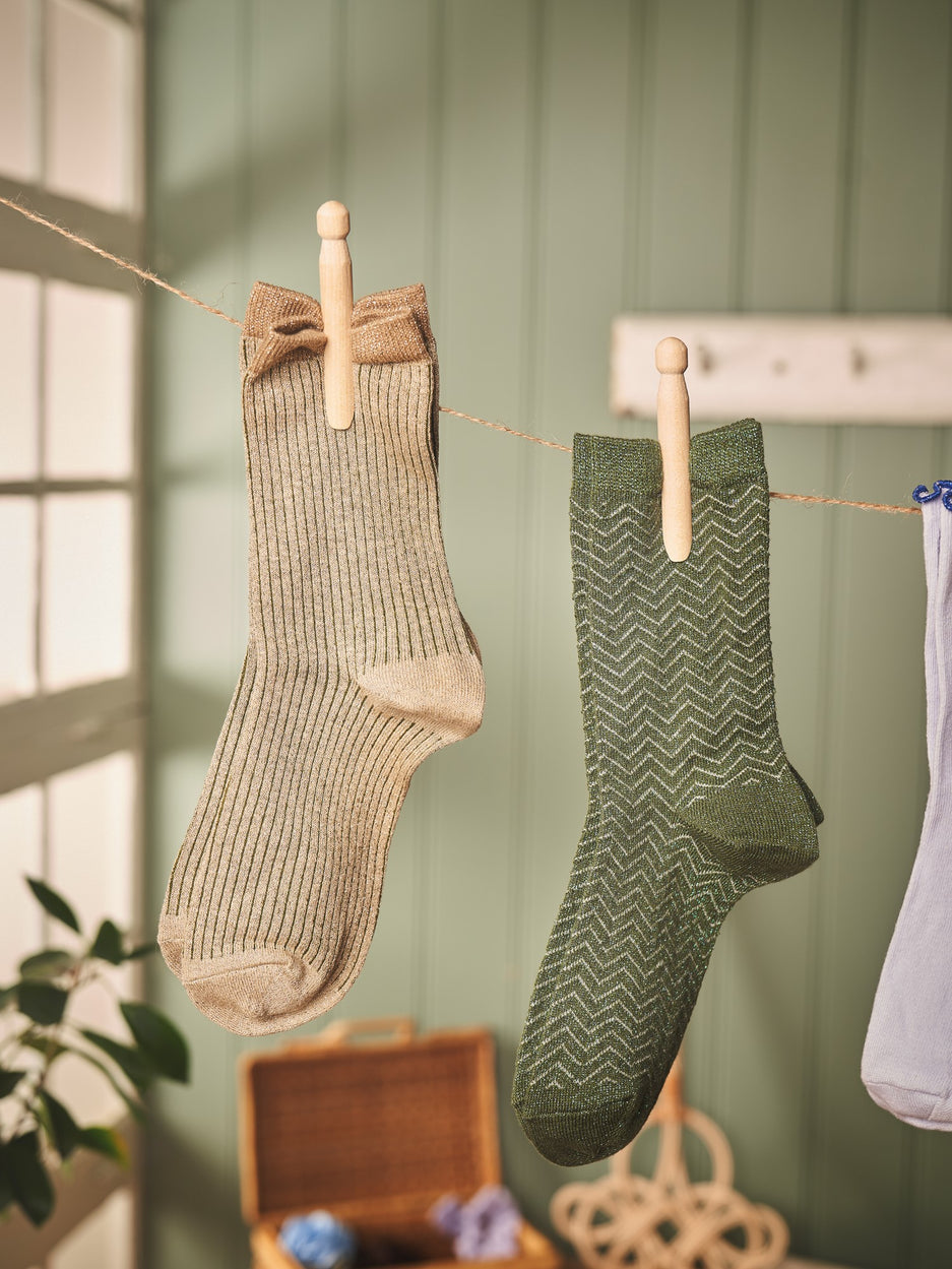 The sisters' glitter socks are made of 59% cotton, 20% polyamide, 19% polyester, and 2% elastane. They are STANDARD 100 by OEKO-TEX®-certified* and a size 36/38.