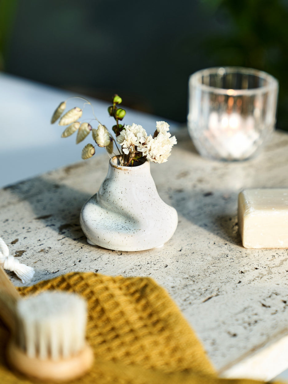 The sisters' stoneware vase measures 8 cm in diameter and 7.5 cm in height.