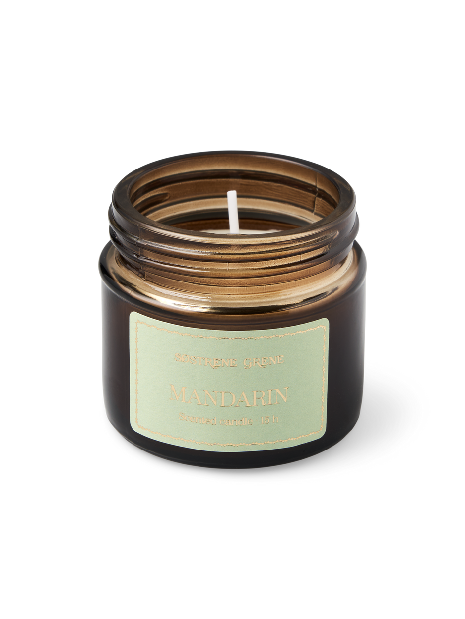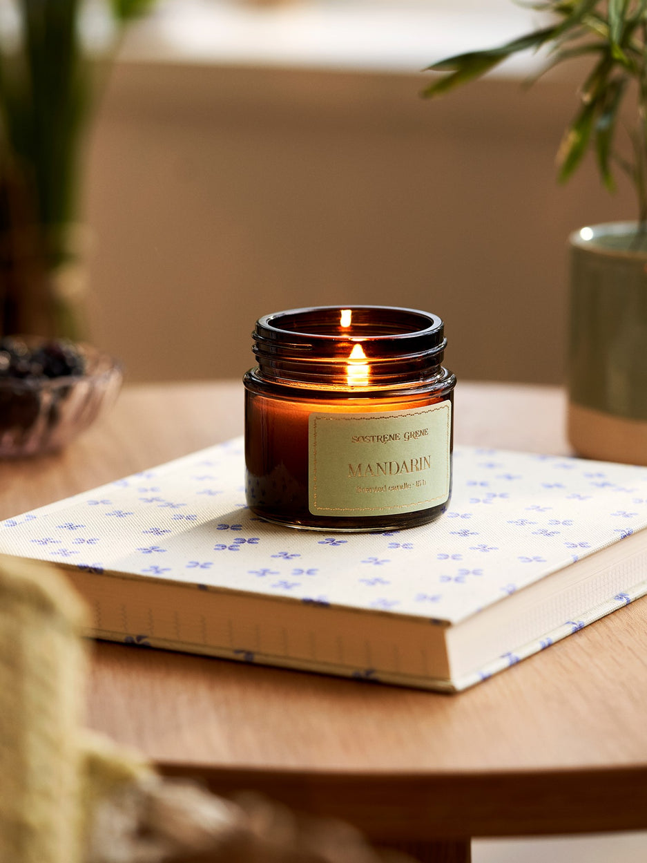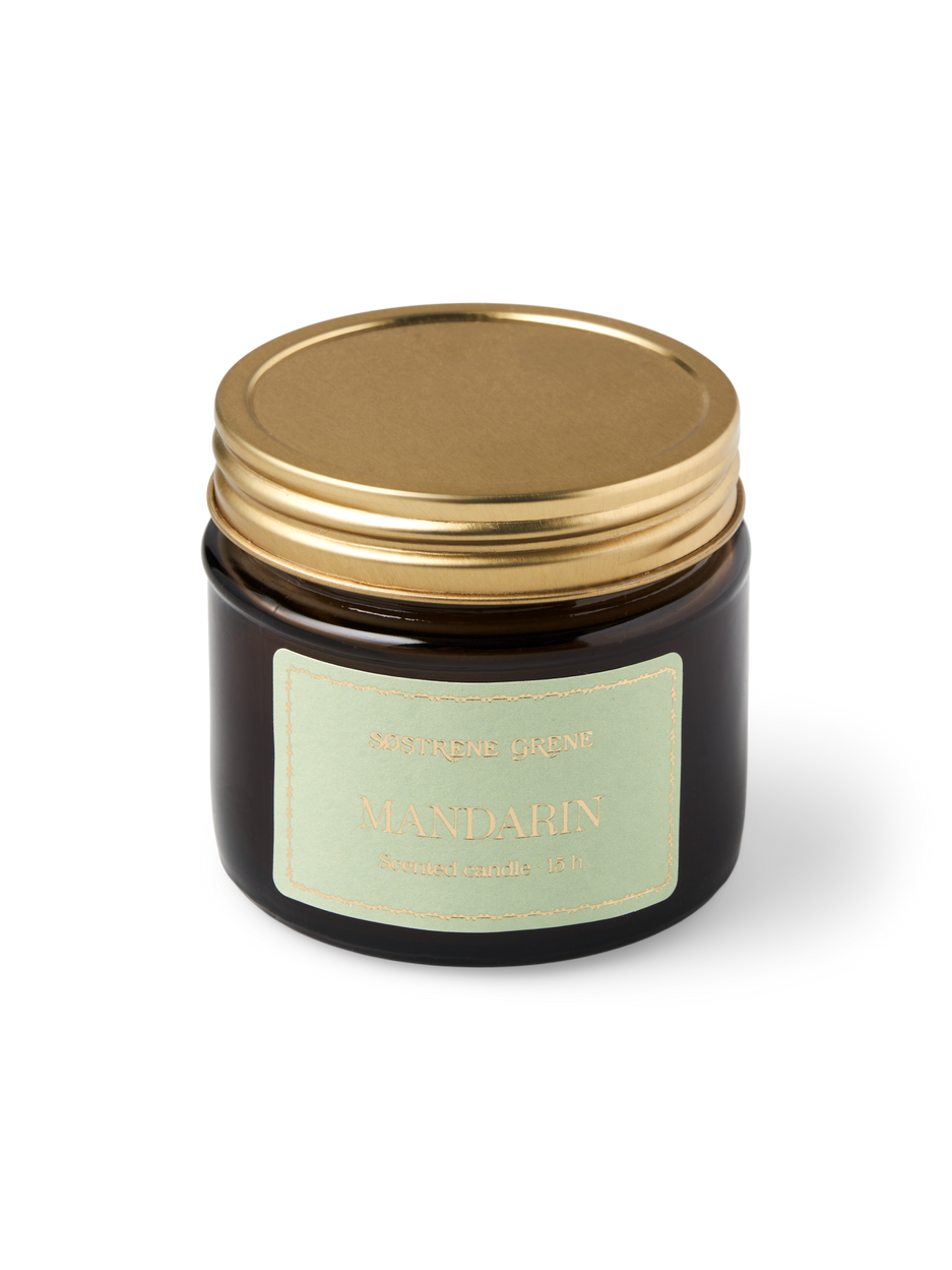 The sisters' scented candle Mandarin is made of rapeseed wax and scent and comes in a glass jar with a metal lid. It has an approximate burn time of 15 hours.