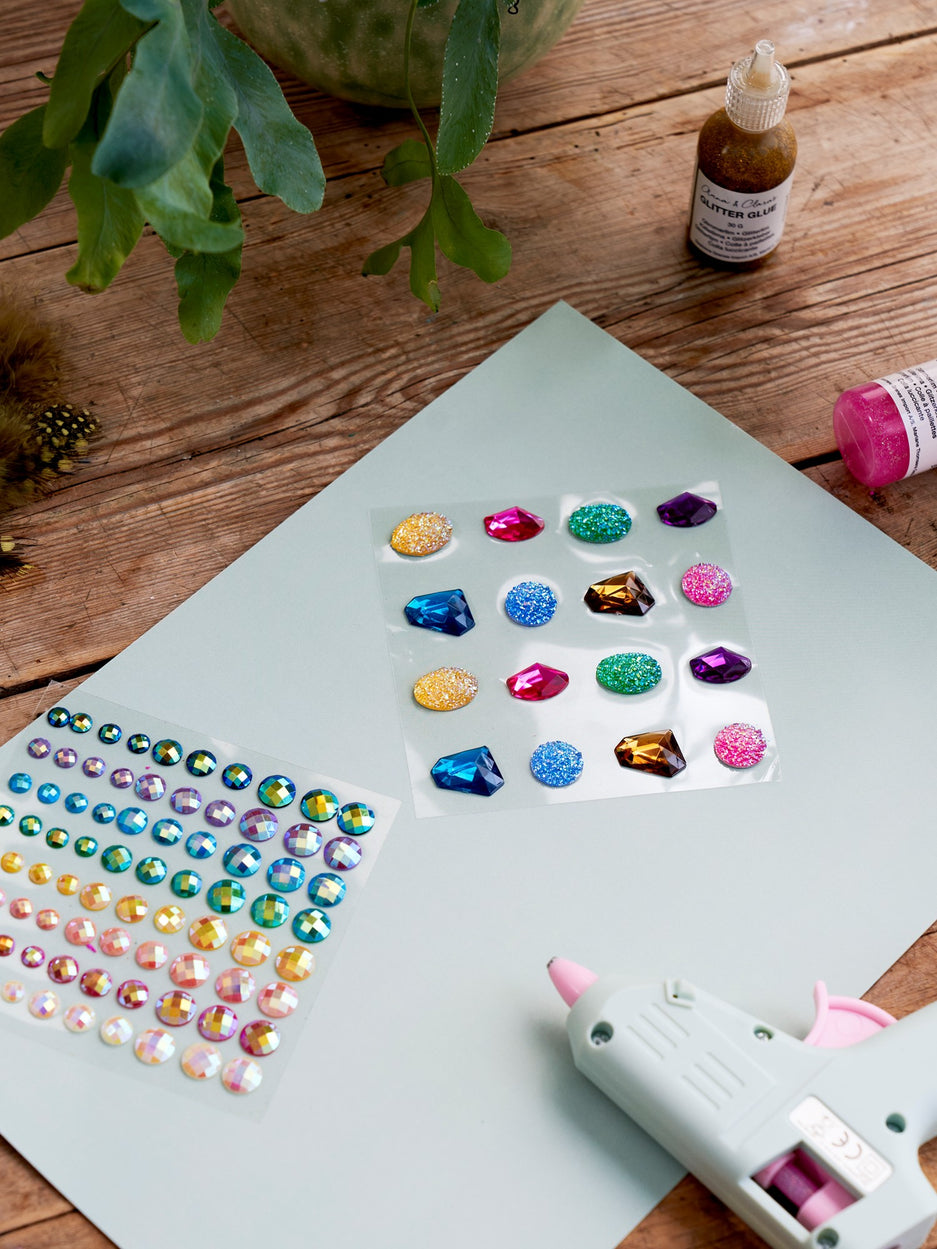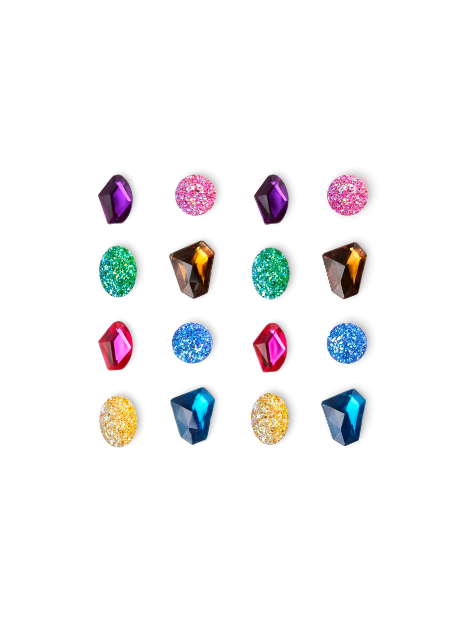 A sheet of the sisters' gemstone stickers has 16 stickers in different shapes and colours.