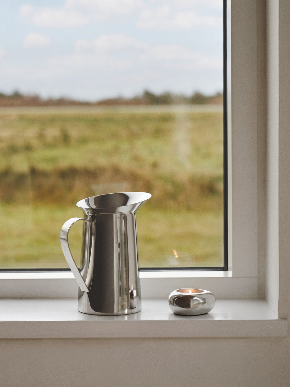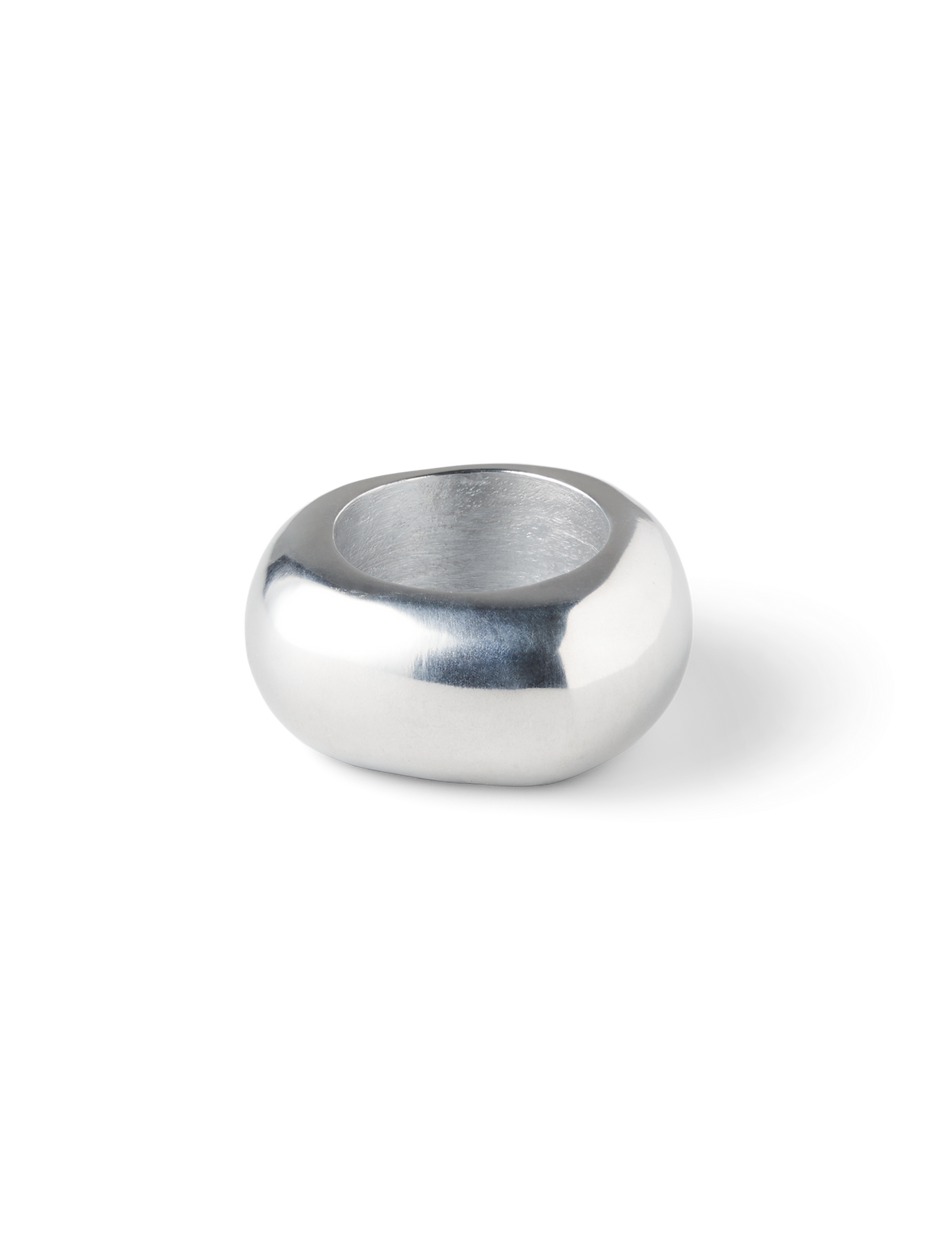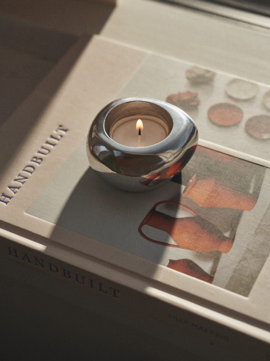 The sisters' tealight holder is made of shiny aluminium, which gives it a chrome-like look.