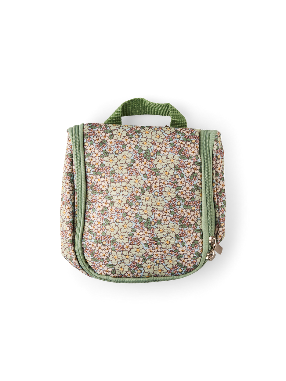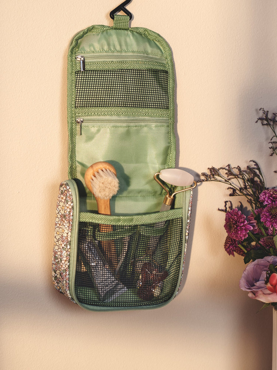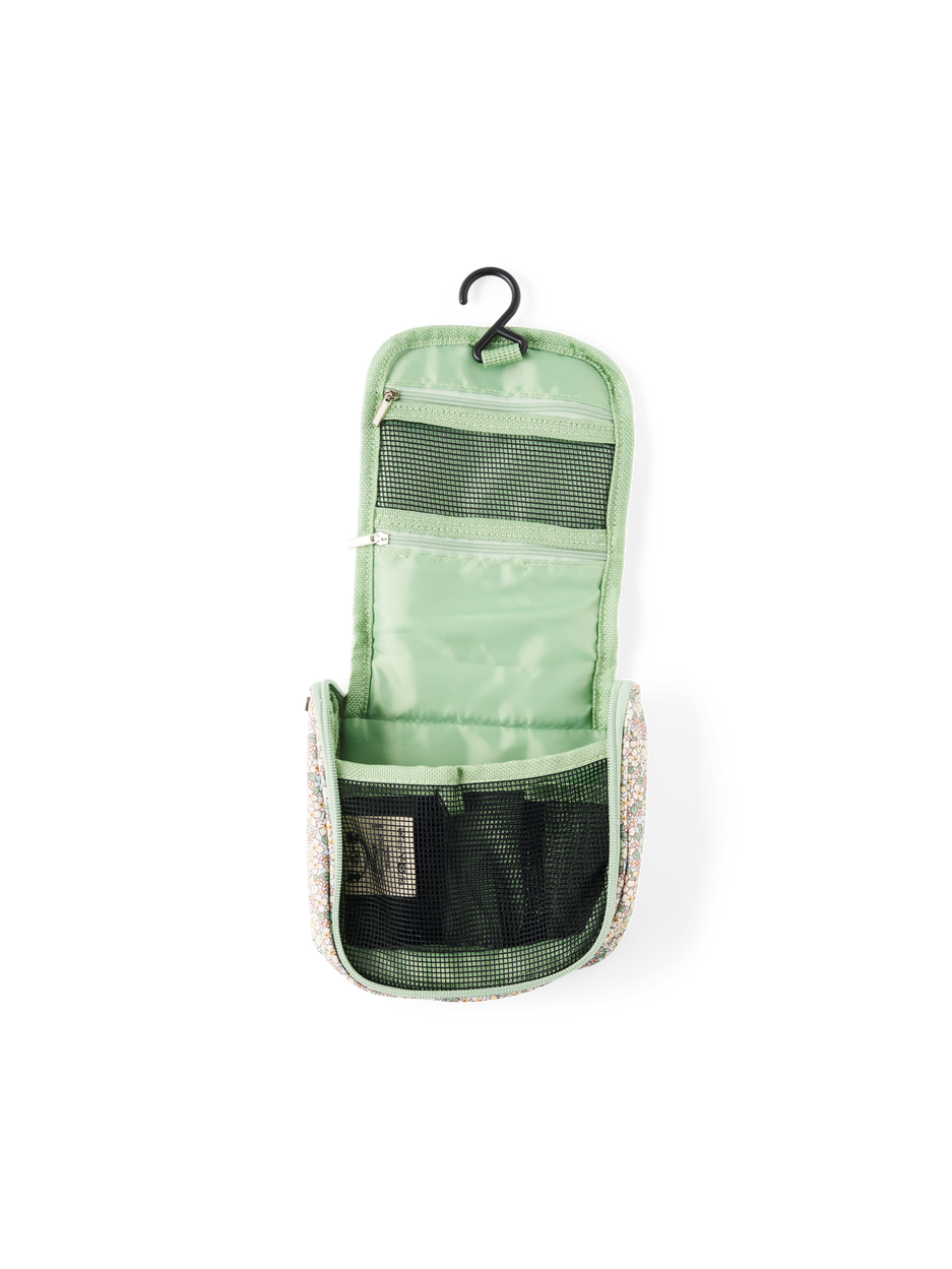 The sisters' toiletry bag is made of polyester and has nylon components. It has a small loop at the top for hanging purposes, and when unfolded, it measures 33 cm.