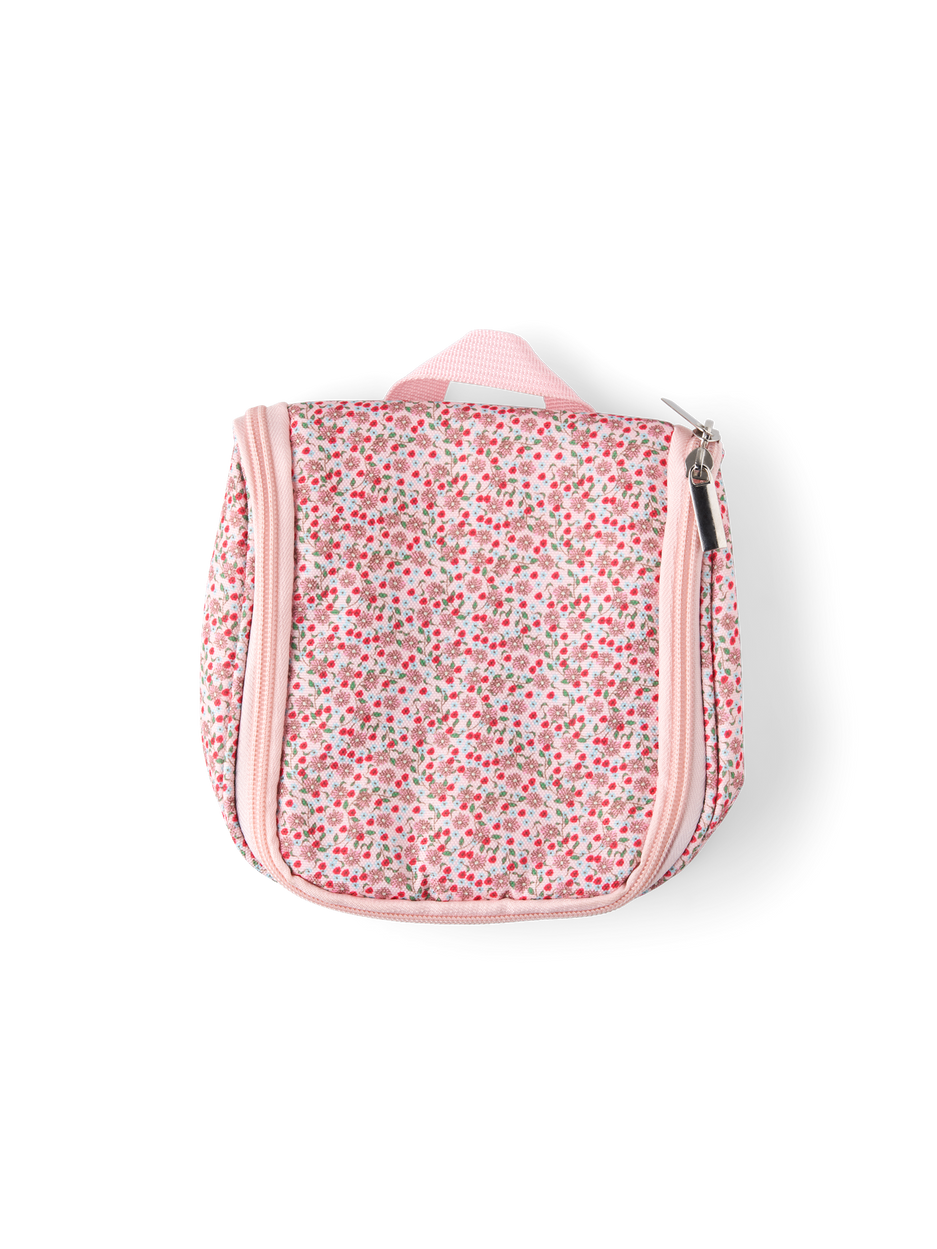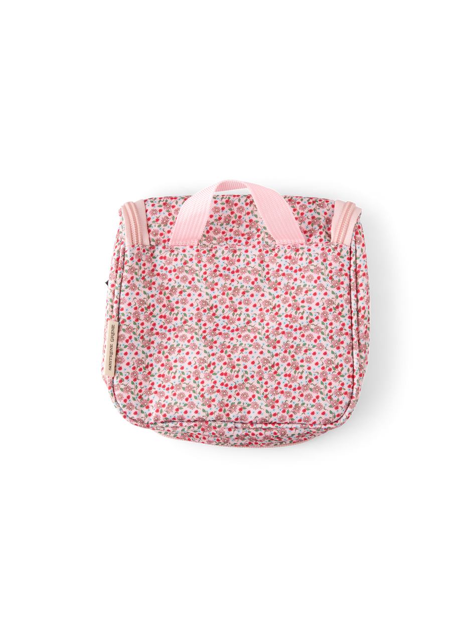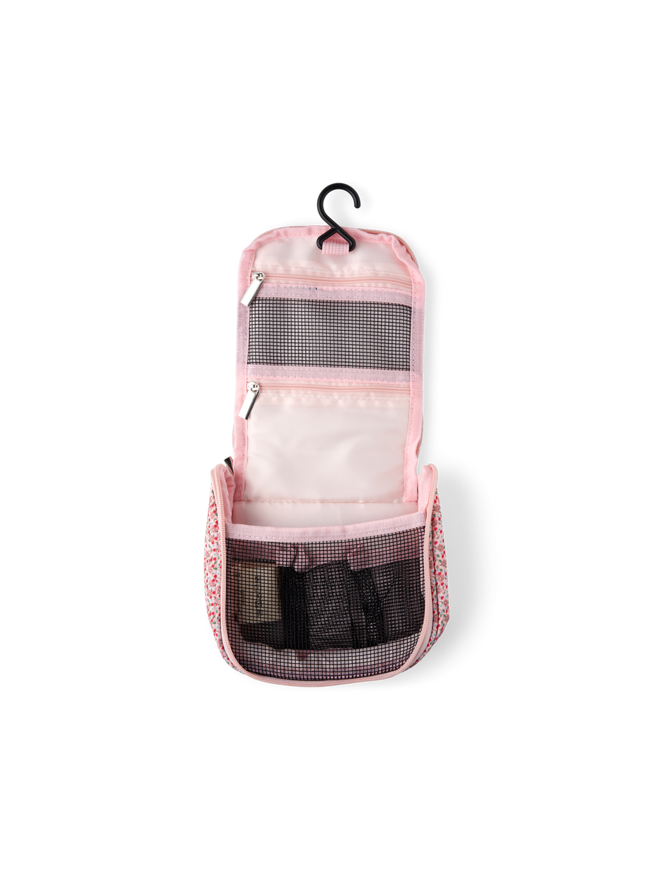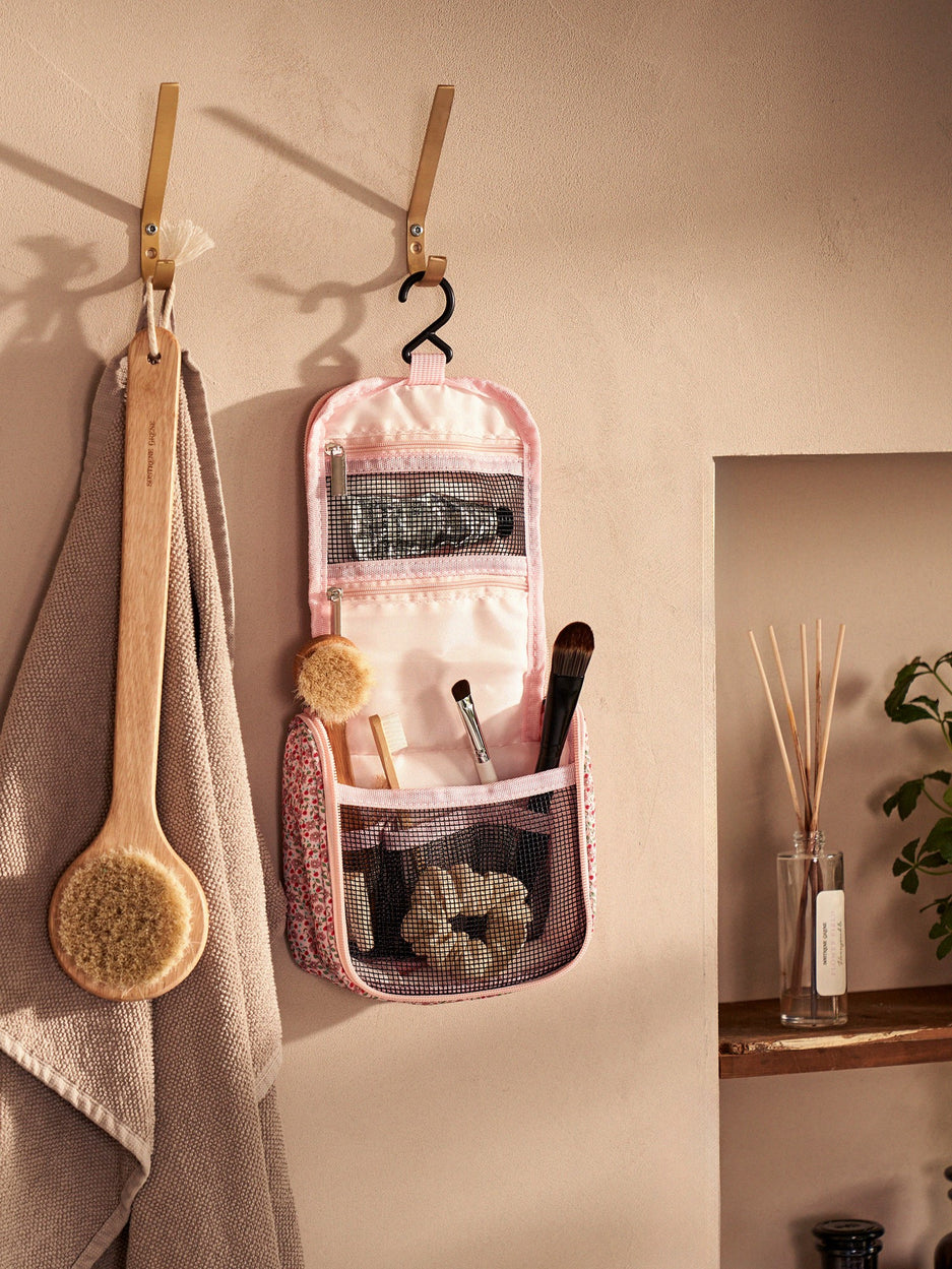 The sisters' toiletry bag is made of polyester and has nylon components. It has a small loop at the top for hanging purposes, and when unfolded, it measures 33 cm.