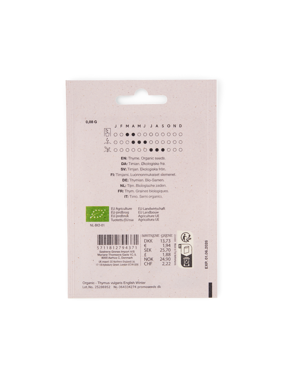 The sisters' thyme seeds are organic. There is 0.08 g in a packet.