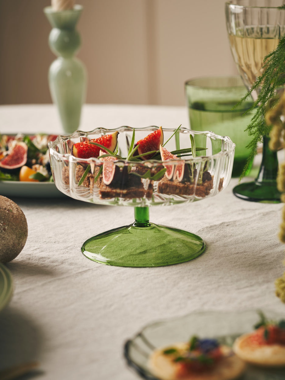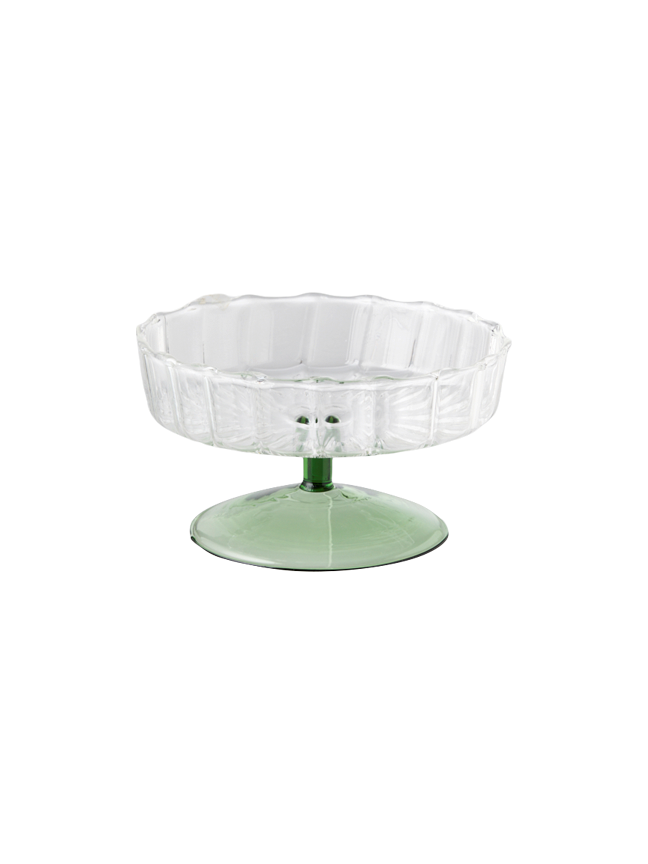 The sisters' bowl is made of glass and measures Ø15 x 8.5 cm. It has a coloured foot.