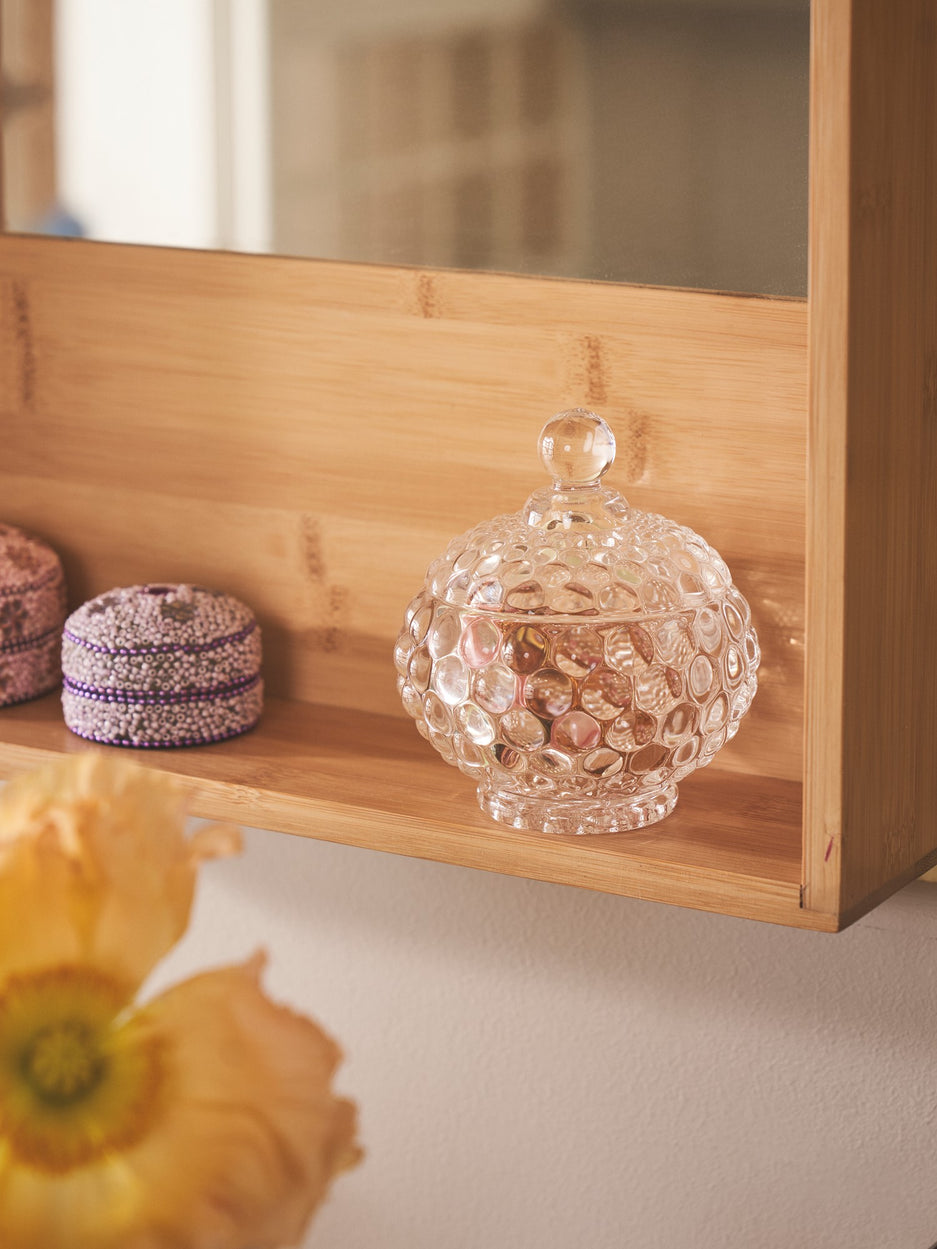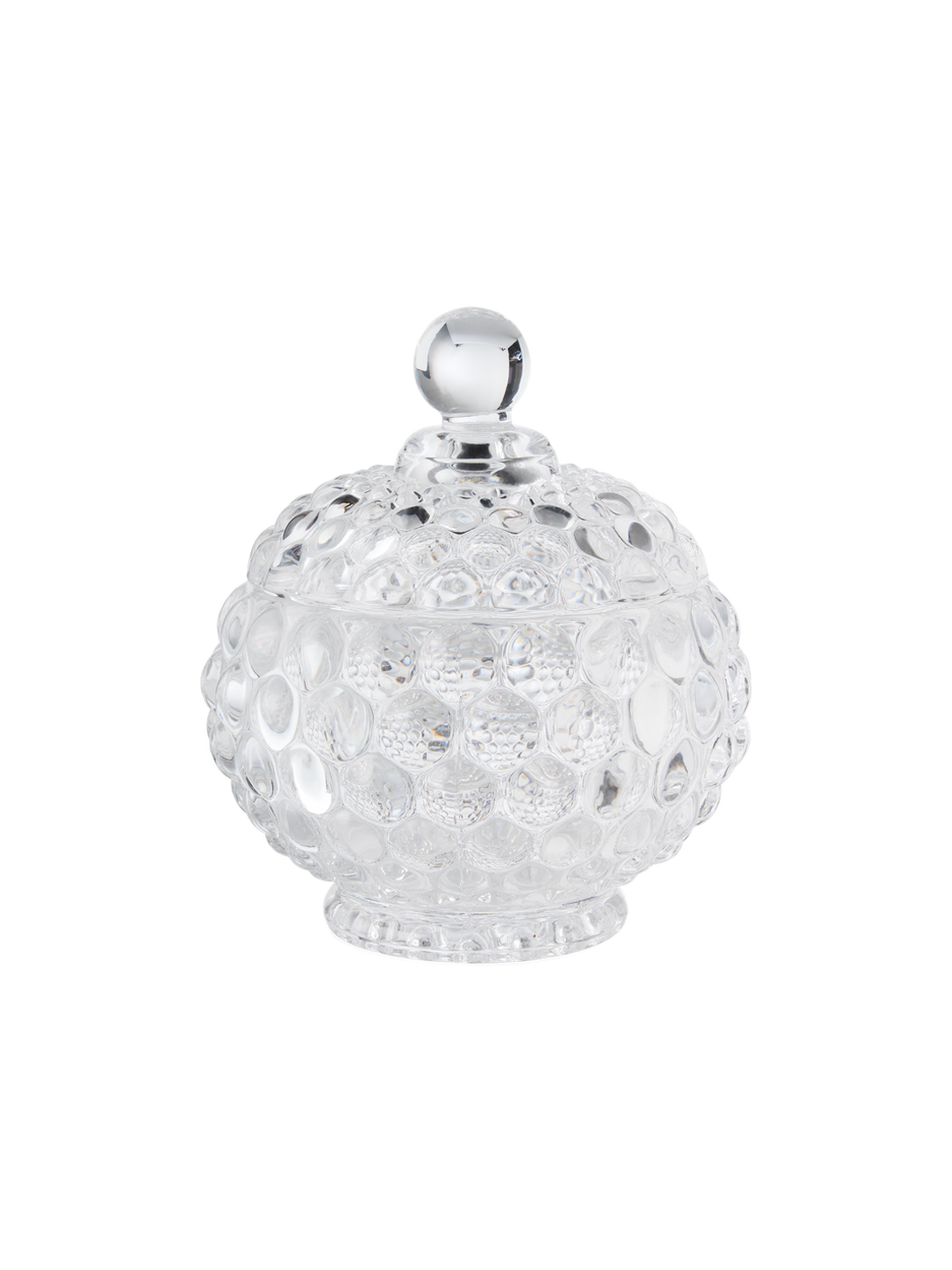 The sisters' decorative jar with lid is made of glass and measures 11 cm in diameter and 10 cm in height.