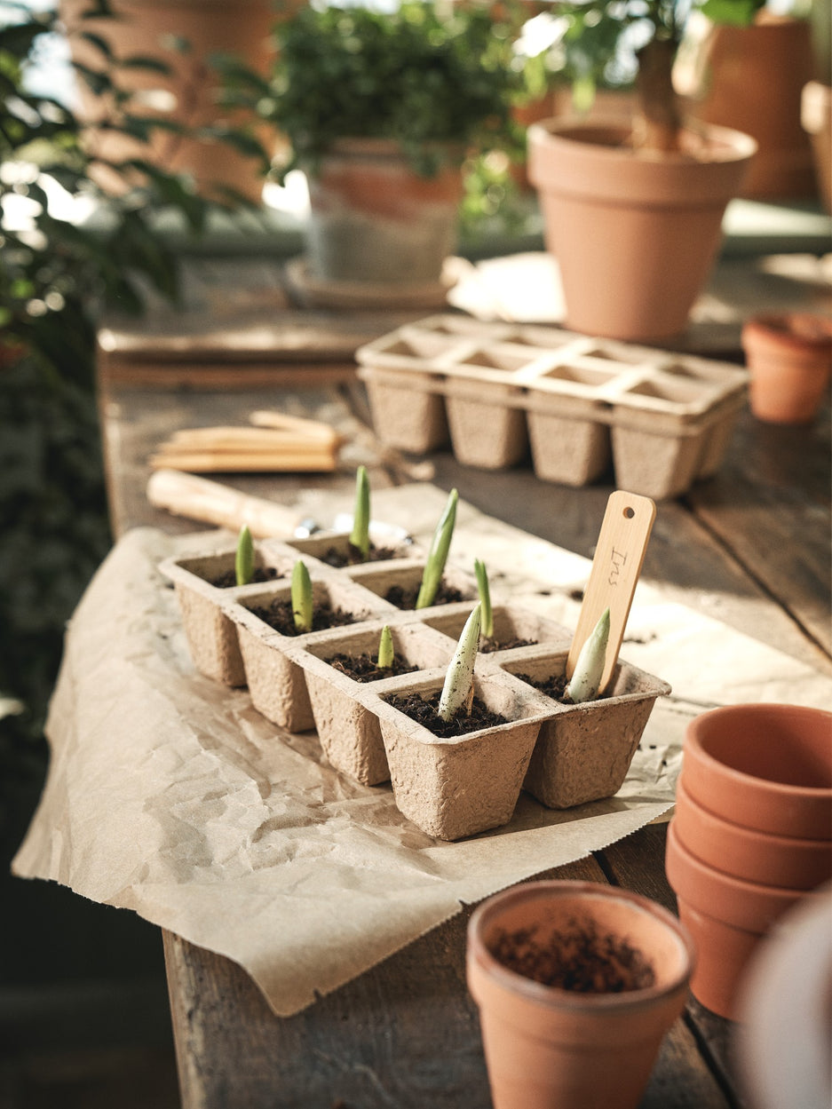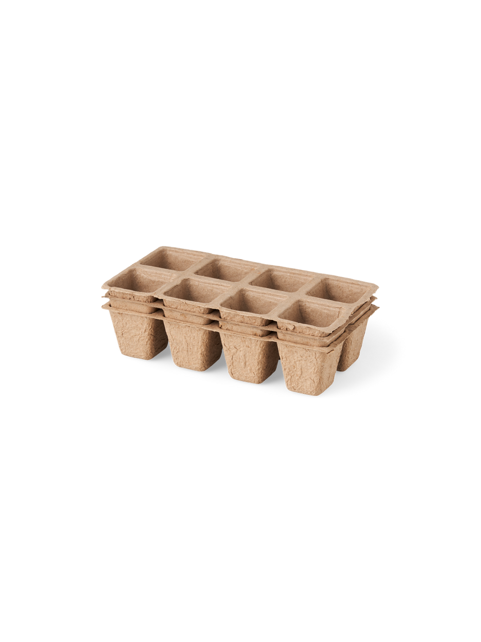 The sisters' seedling trays are made of FSC®-certified paper. Each tray has 8 cells, and a packet contains 3 trays.