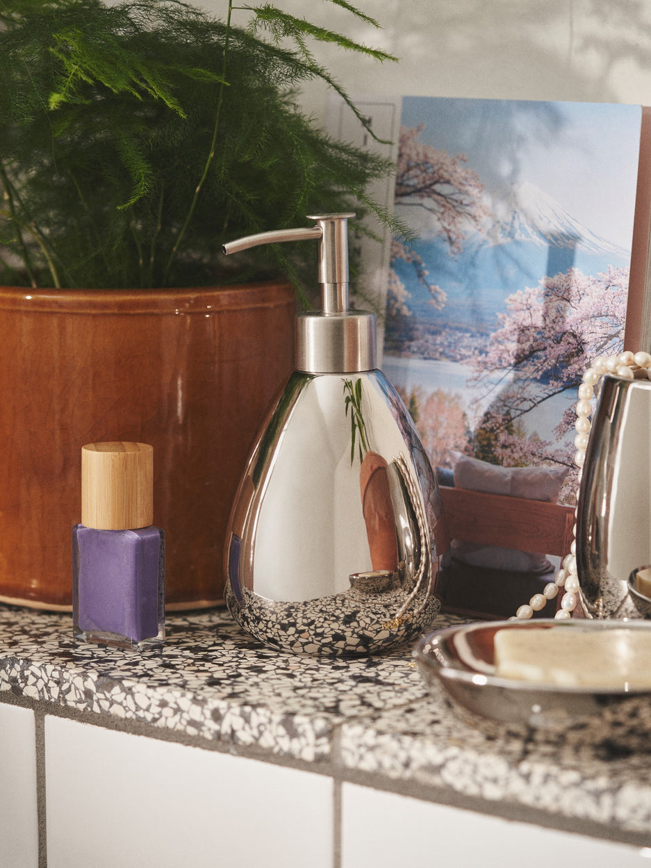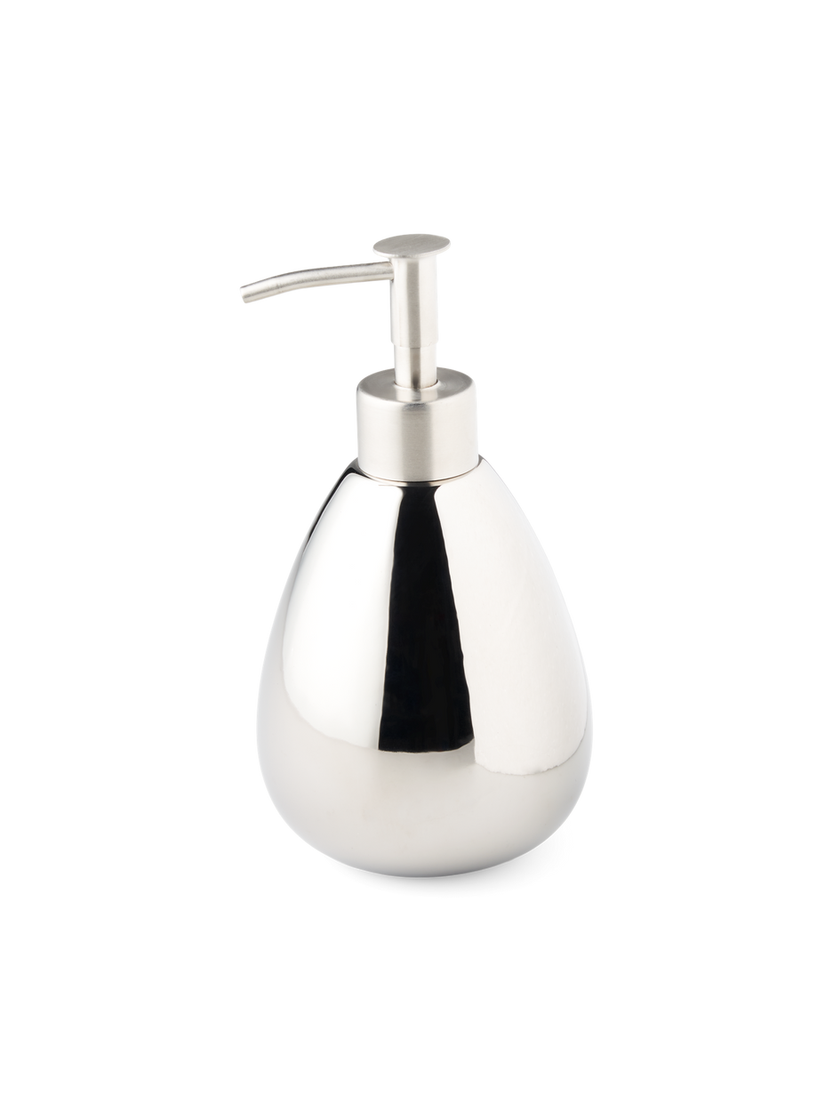 The sisters' ceramic soap dispenser measures Ø8.5 x 17 cm. It has a shiny coating which gives it a chrome-like appearance.