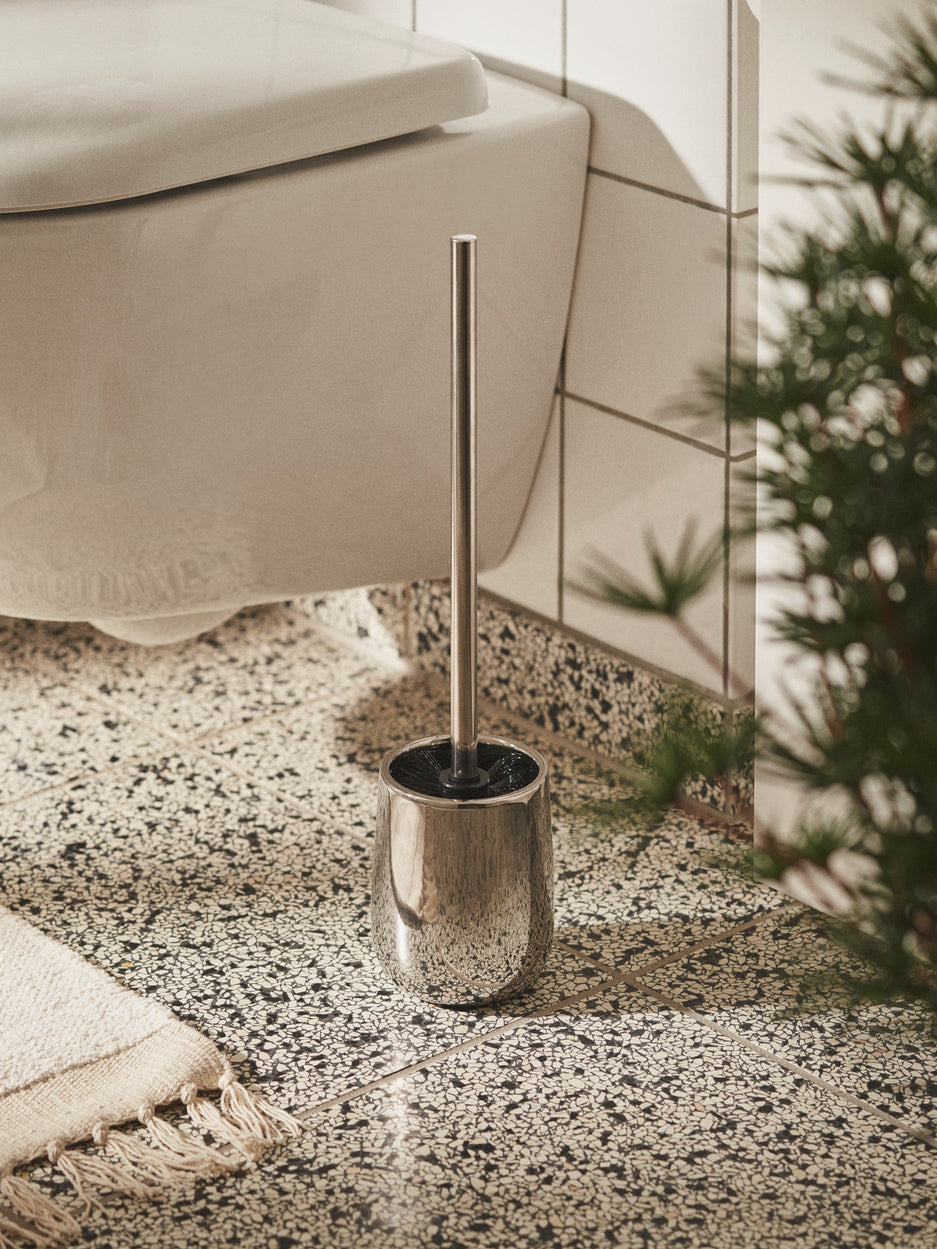 The sisters' ceramic toilet brush holder measures Ø18.5 and with the toilet brush, it has a height of 42 cm. It has a shiny coating which gives it a chrome-like appearance.