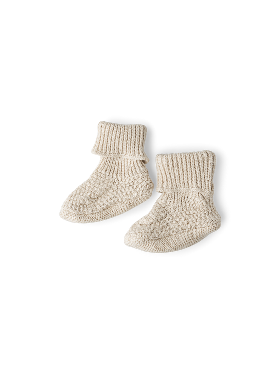 The sisters' knitted baby slippers are made of STANDARD 100 by OEKO-TEX®-certified cotton and are a darling way to keep your little one's feet warm.