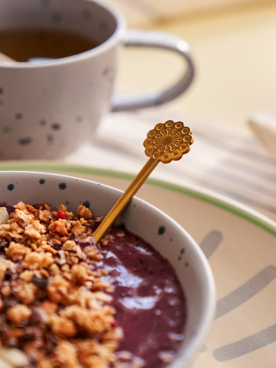 The spoon's head is shaped like a charming flower, which makes it a lovely addition to any tablesetting.