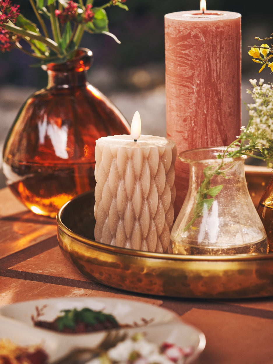 The sisters' LED candle has a layer of paraffin wax for a realistic candle-feel. The candle has a 6 hour-timer, and requires 2 AA-batteries, which are not included.