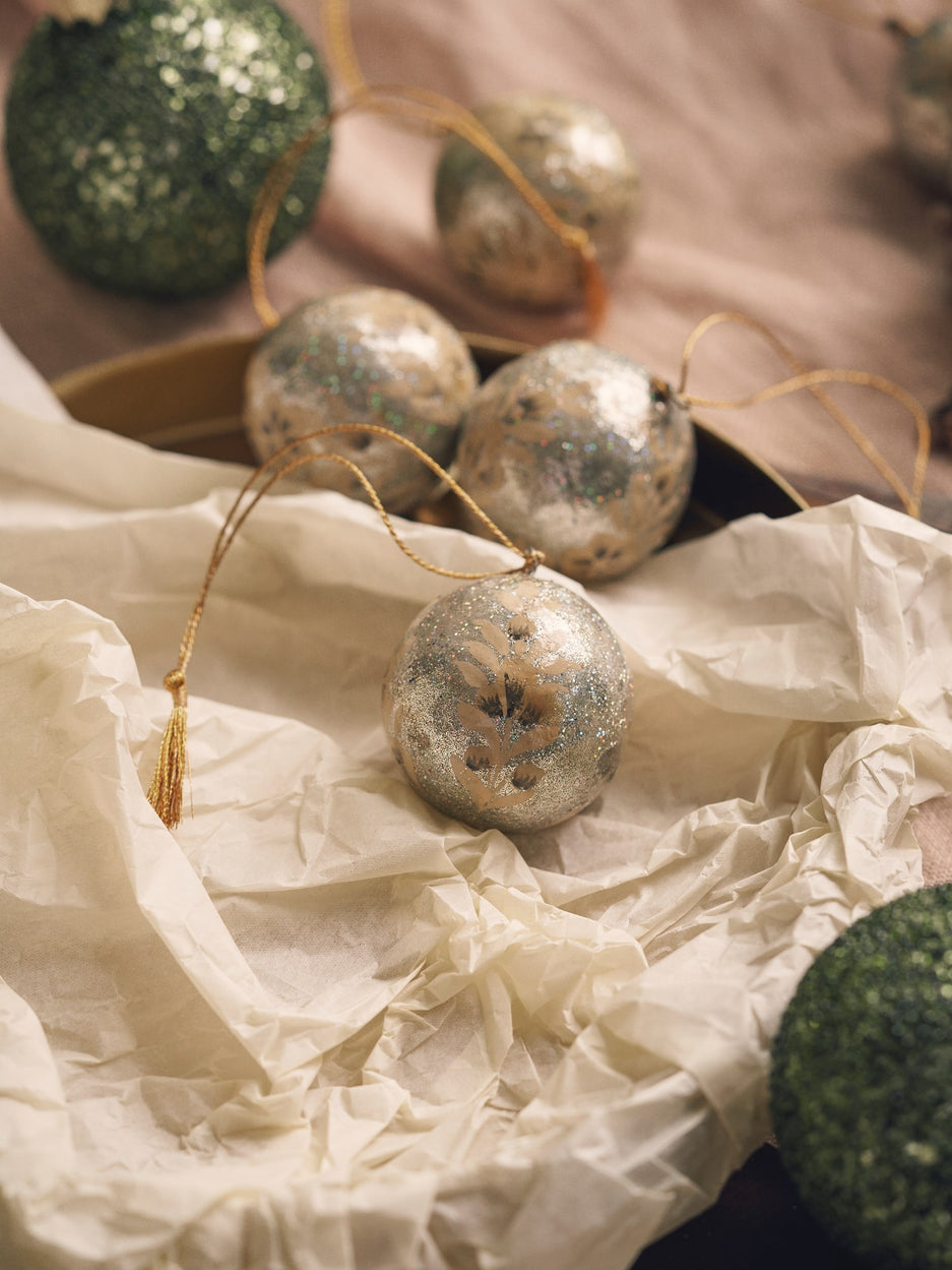 "Such a delightful addition to our Christmas tree," Clara remarks, gently hanging a bauble. "These bring a touch of festive charm to any home," Anna adds, admiring the lovely decorations.
