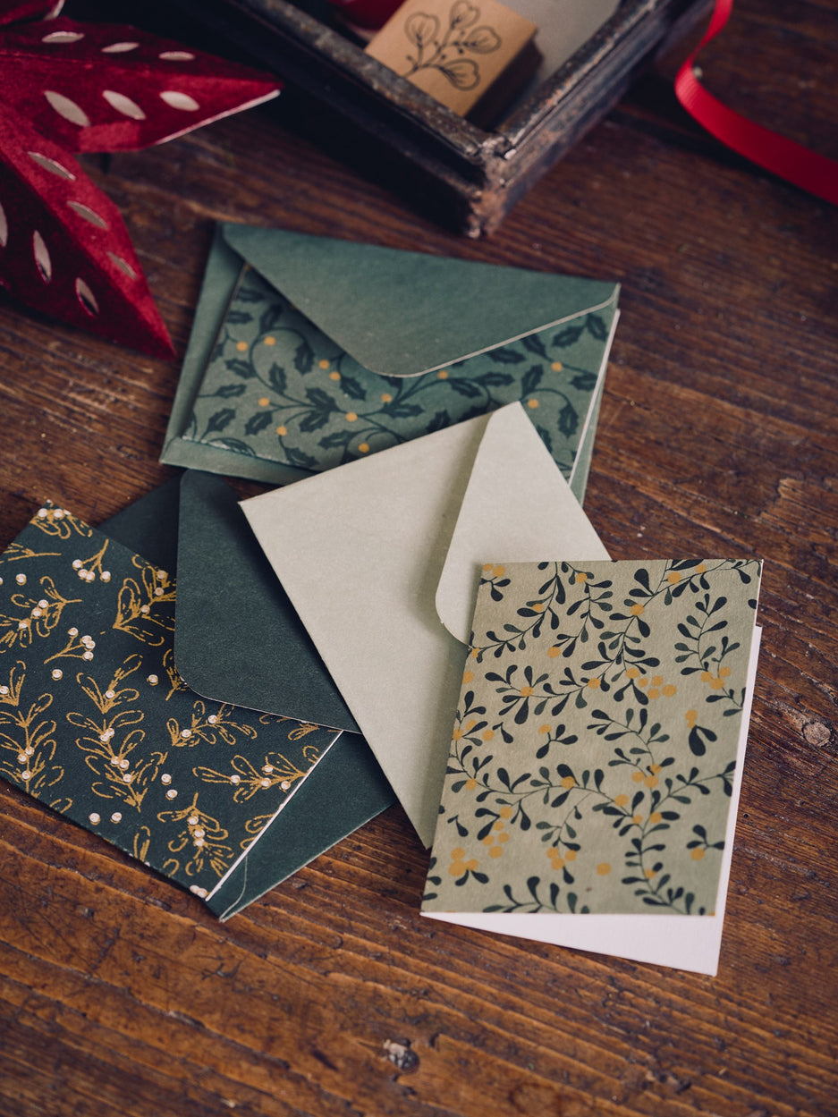 Bómull. 8 x 11 cm. 3 spjöld/3 envelopes.