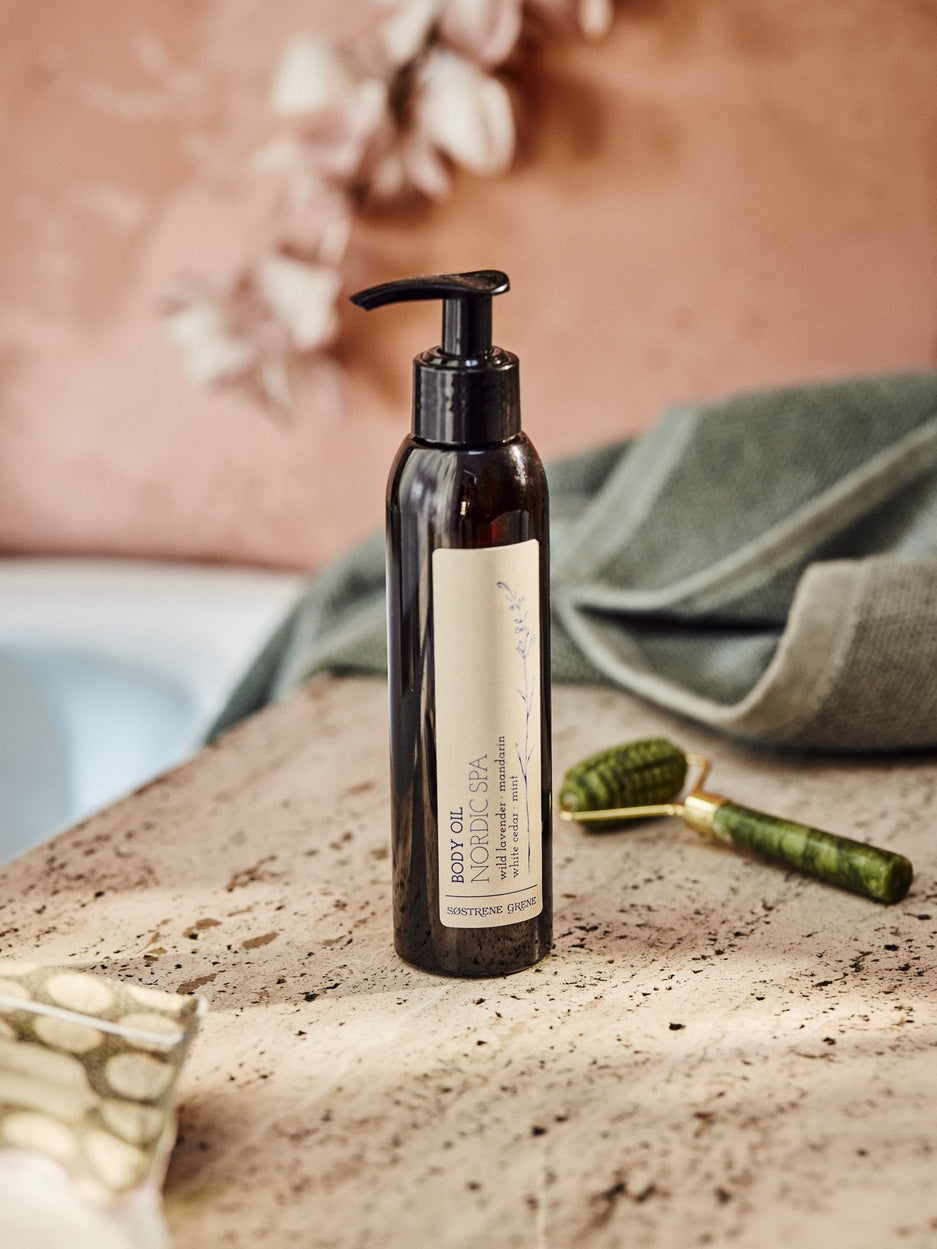 "Nothing like a soothing body oil to end the day," Clara says, gently massaging the oil into her skin. Anna smiles, "Indeed, it brings a lovely glow and a moment of tranquillity to our daily routine."