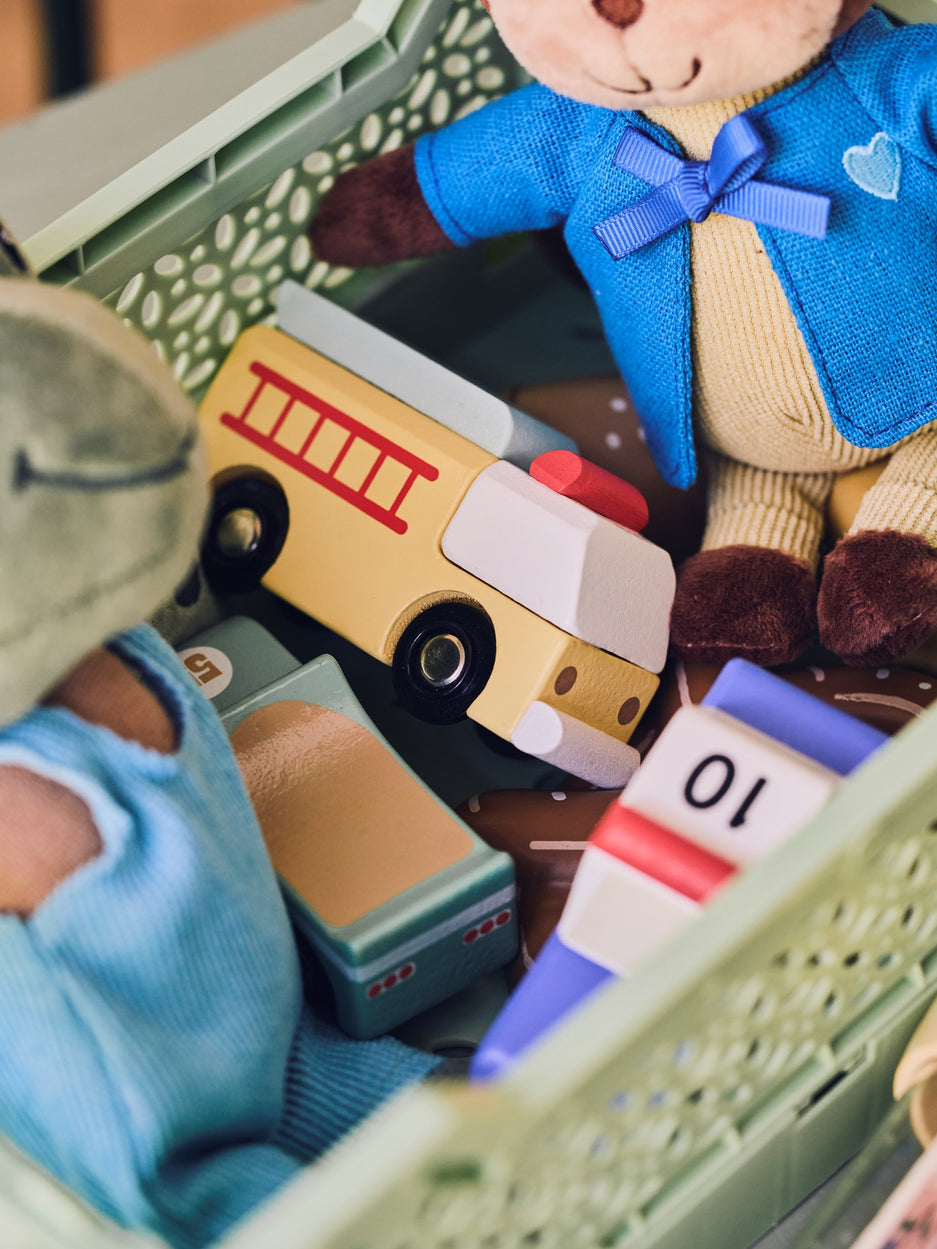 In the nieces' and nephew's room, the sisters have placed a charming wooden fire truck among the delightful toys. "Imagine the adventures they will embark on with this lovely truck," Clara notes.