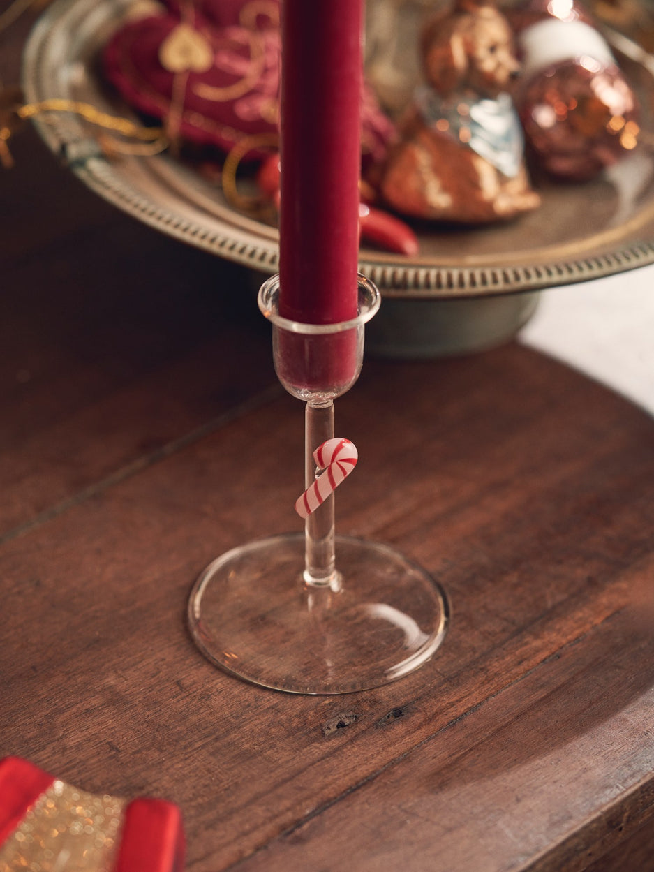 Anna carefully places a candle in the glass holder, its festive candy cane detail catching the light. "This brings a touch of whimsy to our décor," she observes. Clara agrees, "A cosy addition, perfect for creating warmth and cheer."