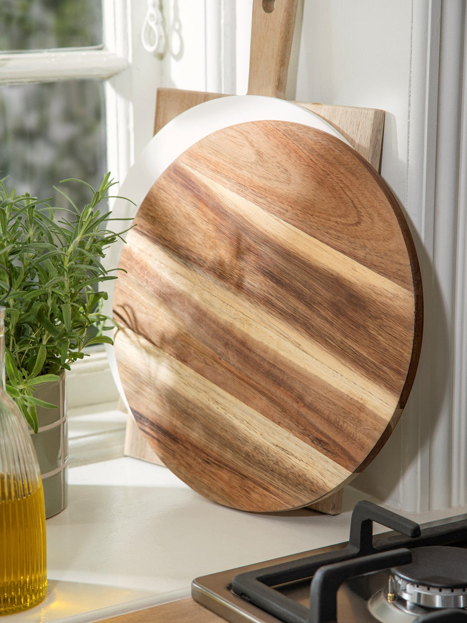 "Such a charming addition to any kitchen," Anna says, admiring the cutting board's natural wood grain. Clara nods, "It is both practical and delightful for preparing meals or serving treats."