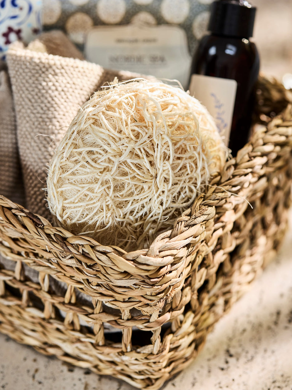 "Exfoliation is a delightful ritual," Anna observes, holding the sisal sponge. Clara adds, "It helps to rejuvenate the skin, leaving it feeling soft and refreshed."
